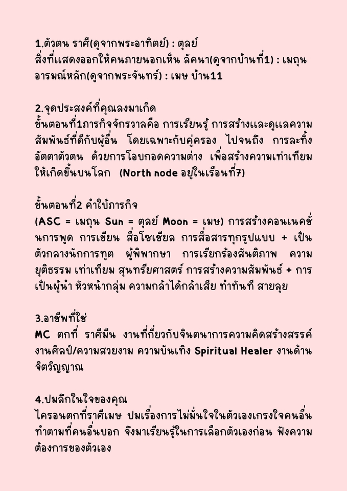 อ่านเบิร์ธชาร์ตโดยประกอบไปด้วย 4 เเพ็คเกจด้วยกัน โดยสามารถดูรายละเอียดจากเเต่ละเเพ็คเกจได้ที่เเพ็คเกจ ขั้นตอนการทำงาน 1. ลูกค้าทักมา 2. เราคุยให้ฟังว่าทำงานยังไง 3. ลูกค้าตกลง 4. เราเขียนใบเเสดงราคา 5. ลูกค้าจ่ายเงินเ 6. ลูกค้าส่งวันเดือนปีเวลาเเละสถานที่เกิด 7. เราอ่านเบิร์ธชาร์ตเเล้วส่งให้เเบบพิมพ์เรียบร้อยโดยจะอธิบายรายละเอียดดังเเสดงในภาพตัวอย่าง 8. จบเเล้วค่ะ