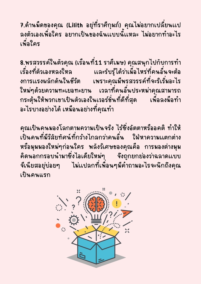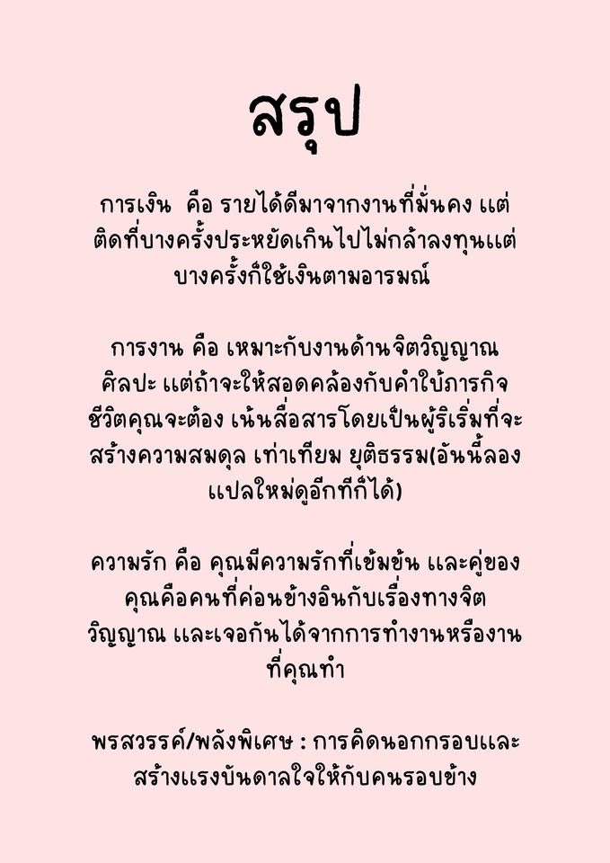 ฿399วิเคราะห์ภาพรวมของชีวิตในปีที่คุณสนใจอย่างละเอียด ธีมหลักของปีเเละเเต่ละเดือน ถามคำถามเพิ่มเติมได้ 5 คำถาม เเก้ชิ้นงานได้ 1 ครั้งกรณีถามคำถามเพิ่มเติม