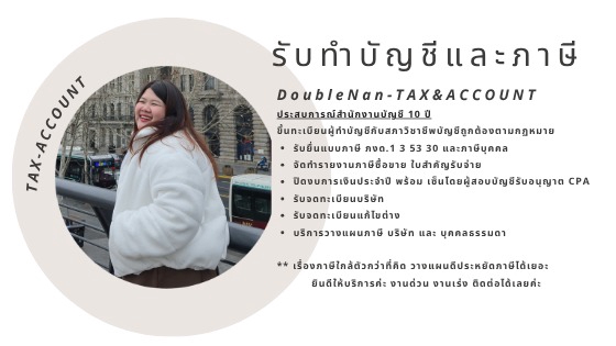 ประสบการณ์สำนักงานบัญชี 10 ปี ขึ้นทะเบียนเป็นผู้ทำบัญชีกับสภาวิชาชีพบัญชีถูกต้องตามกฏหมาย รับทำบัญชี ยื่นภาษี - ยื่นแบบภงด 1 3 53 30 ประกันสังคม - ทำเอกสารใบสำคัญรับจ่าย - จัดทำงบการเงินพร้อมผู้ตรวจสอบบัญชี ที่มีใบอนุญาต CPA ถูกต้องตามกฏหมาย - พร้อมให้คำปรึกษาปัญหาบัญชีต่างๆ และวางแผนภาษี ขั้นตอนการทำงาน 1. รับเอกสารรายได้ค่าใช้จ่ายจากลูกค้า สามารถส่งเอกสารทางไปรษณีย์ได้หรือสแกนเป็นไฟล์ส่งทางอีเมล 2. จัดทำรายงานภาษีซื้อขาย บันทึกค่าใช้จ่าย ยื่นแบบต่างๆ ลูกค้าสามารถชำระภาษีด้วยตนเองได้บนระบบสรรพากรหรือให้จัดส่งเป็นใบจ่ายให้ได้ 3. จัดส่งแบบพร้อมใบเสร็จให้ลูกค้า 4. ระหว่างเดือนสามารถสอบถามเรื่องการจัดทำการเอกสารได้ตลอด 5. จัดทำงบการเงิน พร้อมให้ปรึกษาเรื่องภาษี 6. จัดส่งงบทดลองกระดาษทำการ แยกประเภทให้ก่อนส่งงบให้ผู้สอบ 7. นำส่งงบการเงินให้ผู้สอบตรวจสอบ หลังจากได้งบแล้วนำส่งให้ลูกค้าเซ็น 8. จัดการยื่นงบการเงินตามระบบกรมพัฒนาธุรกิจการค้าและยื่นแบบภงด50 ตามกรมสรรพากร