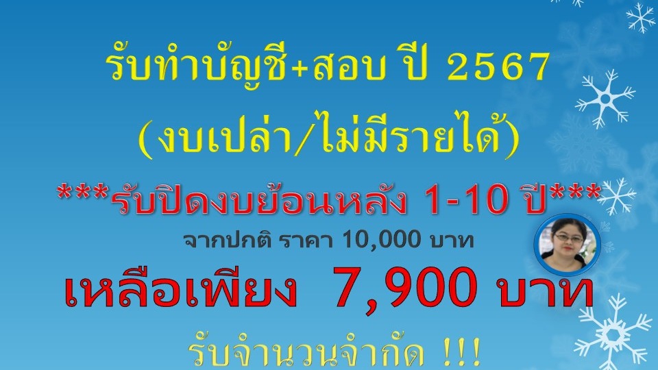 ฿3,900•บันทึกบัญชีใน express (บิลไม่เกิน 20 ใบ) •บันทึกรายวันทั่วไป(JV) •บัญชีแยกประเภท(GL) •ทำงบทดลอง,งบดุล,งบกำไรขาดทุน •ทะเบียนสินทรัพย์ •รายละเอียดประกอบงบการเงิน •ยื่นภงด.50,สบช.3, บอจ.5 ทางออนไลน์