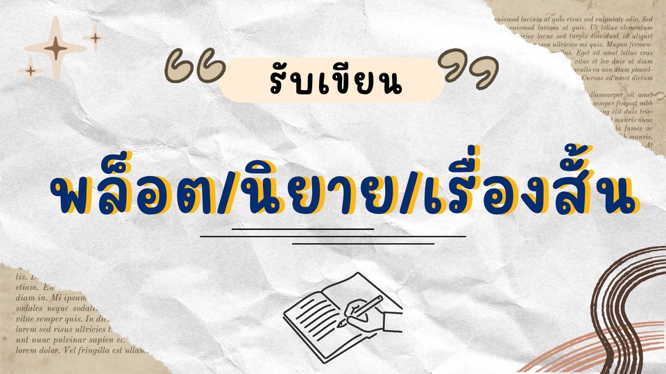 รับเขียนพล็อต/นิยาย/เรื่องสั้น แนวโรแมนติก ดราม่า ตลกขบขัน และอื่นๆได้อีกหลายแนว ลองมาคุยบรีฟงานดูก่อนได้นะคะ มีประสบการณ์แต่งฟิคออนไลน์ในแอพจอยลดา, ReadAWrite มาก่อนค่ะ ขั้นตอนการทำงาน 1. พูดคุยตกลงรายละเอียดตามที่ลูกค้าที่ต้องการว่าเป็นแนวไหน โทนเรื่อง (ฟีลกู้ด, ตลก, โรแมนติก, วาย, ยูริ, อื่นๆ), ตัวละคร, พล็อตหลัก, ความยาวของนิยาย, จำนวนตอนที่ต้องการ 2. การวางโครงเรื่องเบื้องต้น หรือกำหนดเหตุการณ์หลักๆ ที่จะเกิดขึ้น รวมถึงการสร้างตัวละครหลักและรองหากลูกค้าต้องการ 3. เริ่มเขียนร่างแรกตามที่ตกลงกันไว้ และจะพยายามให้ตรงตามแนวทางและโทนที่ลูกค้าต้องการ 4. การส่งร่างแรกให้ลูกค้าตรวจสอบ หากลูกค้าไม่พอใจหรืออยากให้ปรับอะไรเพิ่มเติมก็สามารถให้คำแนะนำและติชมเพิ่มเติมได้ 5. ปรับแก้ไขงานตามคำแนะนำของลูกค้า เพื่อให้ตรงตามความต้องการมากที่สุด 6. จัดทำไฟล์ในรูปแบบ .docx หรือ .pdf และส่งงานให้ลูกค้า หากลูกค้าต้องการการแก้ไขเพิ่มเติมจะดำเนินการแก้ให้จนกว่าลูกค้าจะพอใจ (ฟรีสำหรับการแก้ไข 1 ครั้ง)
