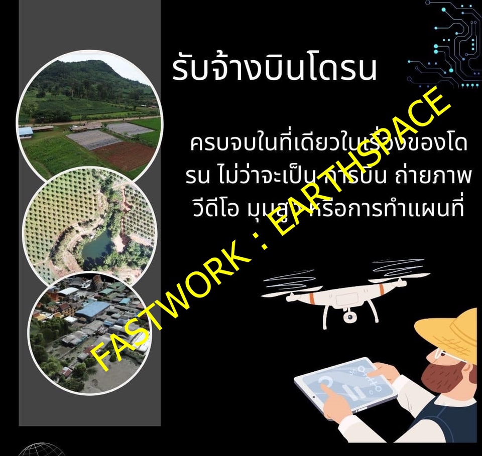 1. การจัดเก็บภาพ วีดีโอ จากโดรนภายในพื้นที่ที่ลูกค้าต้องการ 2. การจัดทำแผนที่ภาพถ่ายทางอากาศจากโดรน (สามารถนำไปรังวัดขนาดพื้นที่ - ระบุตำแหน่ง) ได้ 2. การนำข้อมูลจากการทำแผนที่จากโดรน ในการจัดทำข้อมูล เส้นชั้นความสูง (Contour) , ความสูงจากระดับน้ำทะเล (DEM) , ความลาดชันของพื้นที่ (Slope) ในระยะเวลาอันรวดเร็ว 4. ไปสู่การนำข้อมูลไปต่อยอดทางด้านเทคโนโลยีสารสนเทศภูมิศาสตร์ (GIS) 4. การเขียนรายงานโครงการที่เกี่ยวกับข้องกับ GIS ทุกรูปแบบ ไม่ว่าจะเป็น รายงานโครงการฯ ที่เกี่ยวข้องกับ GIS , EIA , Thesis เป็นต้น 5.งาน Solution ทาง GIS หรือ งานทุกรูปแบบที่เกี่ยวข้องกับ GIS อาทิ การทำแผนที่ออนไลน์แบบ Open Source ขั้นตอนการทำงานสำหรับ 1. พูดคุยแจ้งรายละเอียดความต้องการของงาน 2. ตกลงขอบเขตงาน ระยะเวลาในการทำงาน และราคา ชำระเงิน 3. ส่งงานครั้งแรก หากไม่มีแก้ไขถือว่าเสร็จสิ้นการรับงาน 4. หากมีการแก้ไข สามารถแก้ไขงานเพิ่มเติมได้ไม่เกิน 3 วัน นับจากที่ตกลงแก้ไขงานครั้งแรก ขั้นตอนการทำงาน 1. พูดคุยแจ้งรายละเอียดความต้องการของงาน 2. ตกลงขอบเขตงาน ระยะเวลาในการทำงาน และราคา ชำระเงิน 3. ส่งงานครั้งแรก หากไม่มีแก้ไขถือว่าเสร็จสิ้นการรับงาน 4. หากมีการแก้ไข สามารถแก้ไขงานเพิ่มเติมได้ไม่เกิน 3 วัน นับจากที่ตกลงแก้ไขงานครั้งแรก