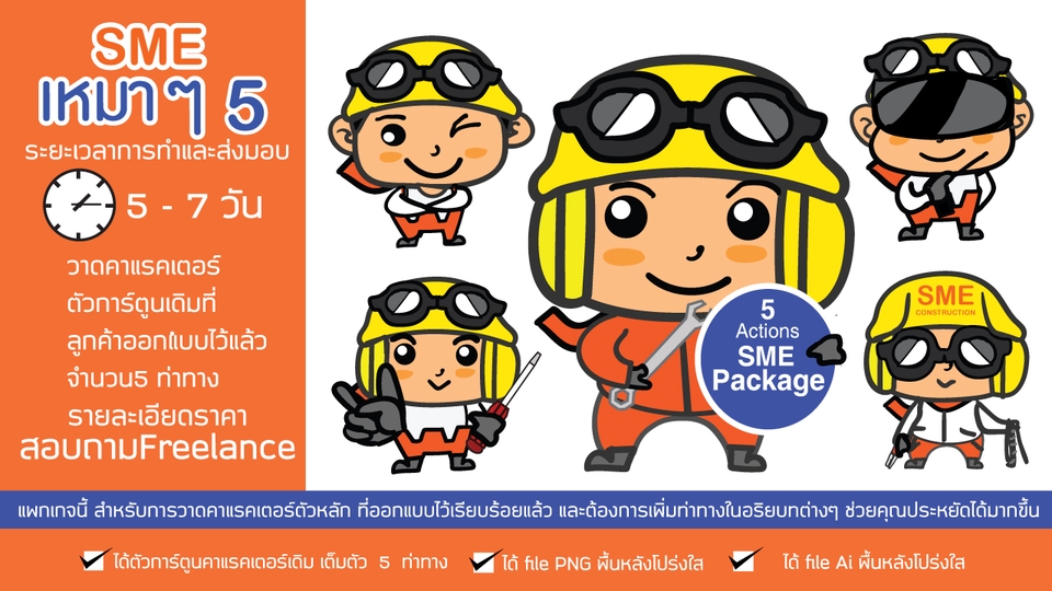 เป็นบริการวาดท่าทางของตัวการ์ตูนหรือมาสคอตเดิมที่ลูกค้ามีแบบที่สมบูรณ์อยู่แล้ว แต่อยากได้ท่าทางของตัวการ์ตูนเดิมเพิ่มเติม โดยวาดใช้ในโปรแกรมIllustrator หรือ Photoshop ( ขึ้นกับลักษณะงานต้นแบบที่ให้มา ว่าใช้เทคนิคไหน ) ส่งมอบเป็น Digital File PNG และ JPG file และ Ai File หรือ PSD file ขั้นตอนการทำงาน 1. ลูกค้าให้โจทย์งานภาพตัวการ์ตูนหรือมาสคอตที่ออกแบบเรียบร้อยแล้วให้กับfreelance ออกแบบ 2. Freelance วาดภาพตัวการ์ตูนเดิม ในAction ใหม่ให้ลูกค้าเลือก 2 รูปที่แตกต่างกัน /1ท่าทาง (ขึ้นกับ แพ็กเกจที่ลูกค้าเลือก ) และลูกค้าต้องเลือกเพียง1รูปที่ถูกใจมากที่สุดเพียง1 แบบ ต่อ1 ท่าทาง 3. Freelance นำภาพ conceptที่ลูกค้าเลือก มาพัฒนาแบบต่อและเก็บรายละเอียดแสงและเงาและแก้ไขสัดส่วนการ์ตูนให้ถุกต้องเรียบร้อย ขั้นตอนนี้ปรับแก้ไขได้มาสุด 5 ครั้ง (แก้ไขเกินมีค่าใช้จ่ายเพิ่ม500บาท แต่สามารถได้สิทธิแก้ไขเพิ่มอีก5ครั้งครับ) 4. หากไม่มีการปรับ แก้ไข Freelanceจะส่งมอบงานตามรูปตัวอย่างสุดท้ายที่ลูกค้าเลือก เข้าระบบของFastwork เพื่อให้อนุมัติและปิดงานครับ