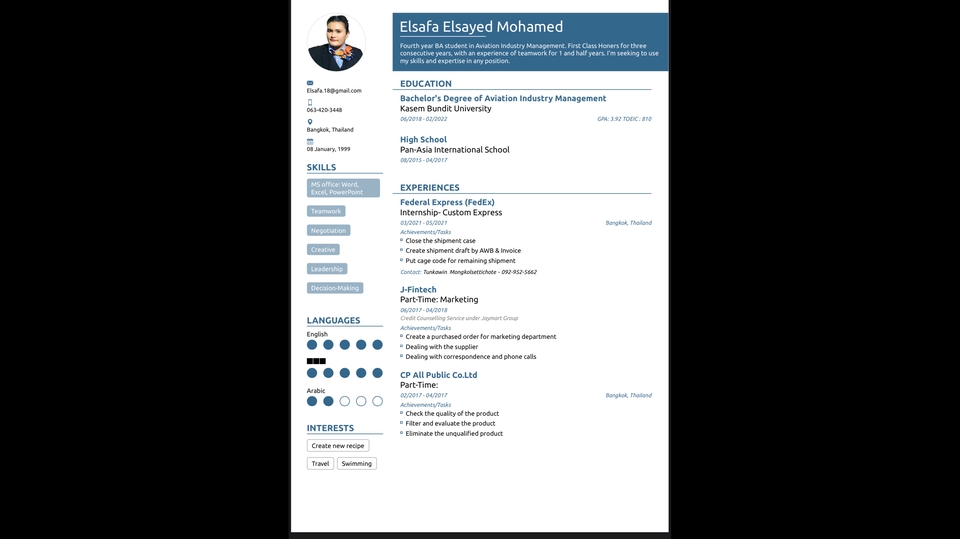 นักวิชาการฝ่ายเคลียร์สินค้าขาเข้า รับขอใบอนุญาตนำเข้า นักศึกษาชั้นปีที่สี่ในสาขาการจัดการอุตสาหกรรมการบินภาคอินเตอร์ เกียรตินิยมอันดับหนึ่งเป็นเวลาสามปีติดต่อกัน ด้วย GPA: 3.92 รับทำ Report, Script, Presentation, Essays etc.