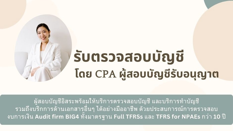 สวัสดีค่ะ เอ็มนะคะ มี CPA ผู้สอบบัญชีอิสระพร้อมให้บริการตรวจสอบบัญชี และบริการทำบัญชี รวมถึงบริการด้านเอกสารอื่นๆ ได้อย่างมืออาชีพ ด้วยประสบการณ์ตรวจสอบงบการเงิน Audit firm BIG4 ทั้งมาตรฐาน Full TFRSs และ TFRS for NPAEs กว่า 10 ปี ขั้นตอนการทำงานสำหรับงานสอบบัญชี 1. ติดต่อเพื่อแจ้งรายละเอียดของบริษัท เช่น รายได้รวม จำนวนรายการค้า และวันเวลาที่ต้องการ เพื่อประเมินค่าบริการ 2. บริษัทฯ นำส่งงบการเงิน รายละเอียด และเอกสารมาให้ผู้สอบบัญชี 3. ผู้สอบบัญชีทำการสอบบัญชี 4. รับรองงบการเงิน โดยจัดส่งงบการเงินพร้อมหน้ารายงานของผู้สอบบัญชีที่ลงนามแล้ว สนใจติดต่อได้เลยนะคะ :) ขั้นตอนการทำงาน 1. ติดต่อเพื่อแจ้งรายละเอียดของบริษัท เช่น รายได้รวม จำนวนรายการค้า และวันเวลาที่ต้องการ เพื่อประเมินค่าบริการ 2. บริษัทฯ นำส่งงบการเงิน รายละเอียด และเอกสารมาให้ผู้สอบบัญชี 3. ผู้สอบบัญชีทำการสอบบัญชี 4. รับรองงบการเงิน โดยจัดส่งงบการเงินพร้อมหน้ารายงานของผู้สอบบัญชีที่ลงนามแล้ว