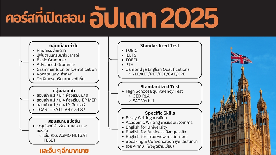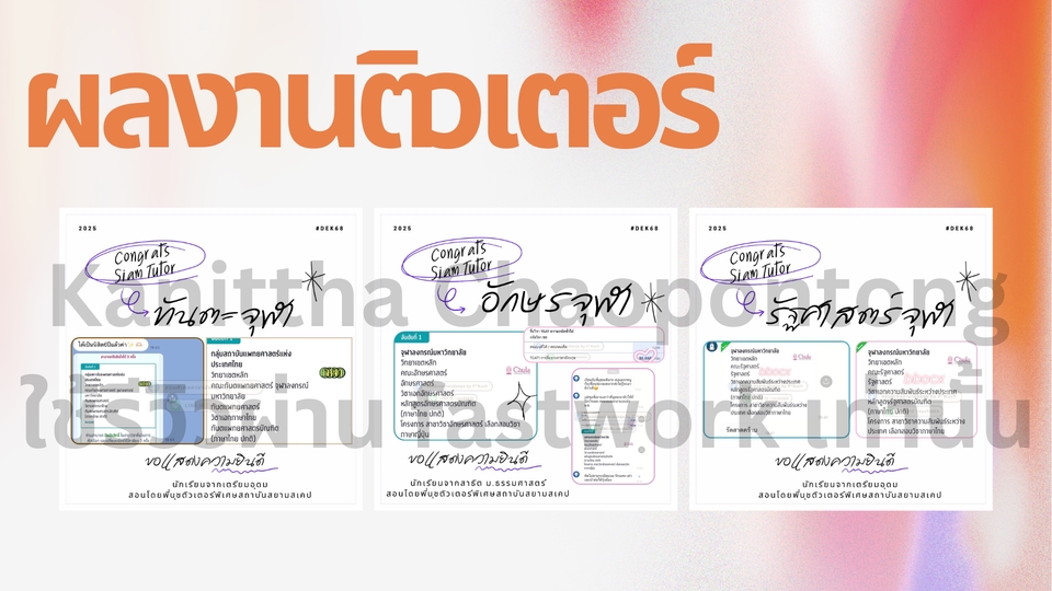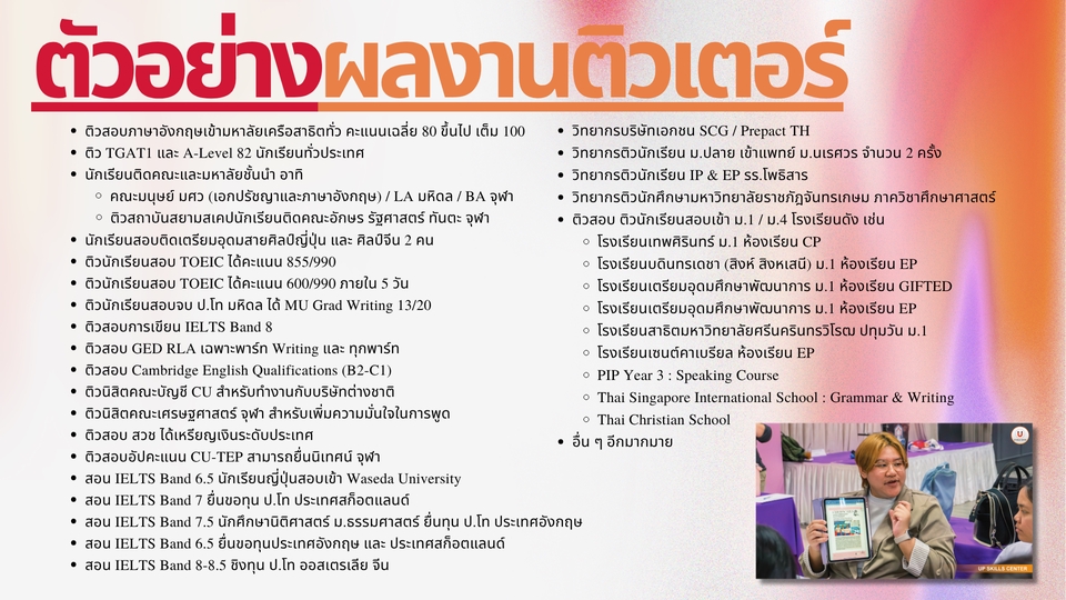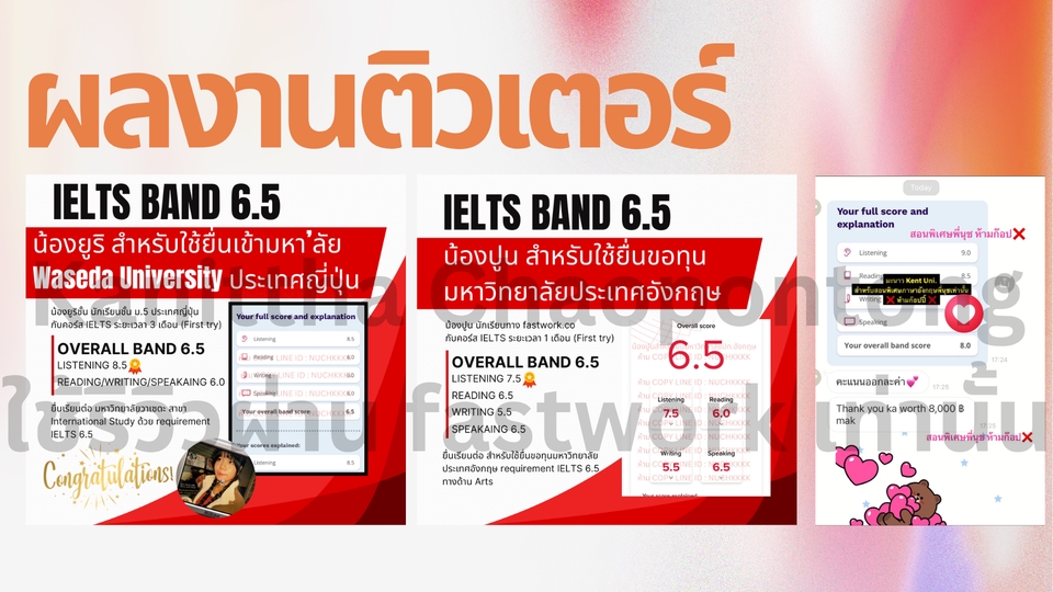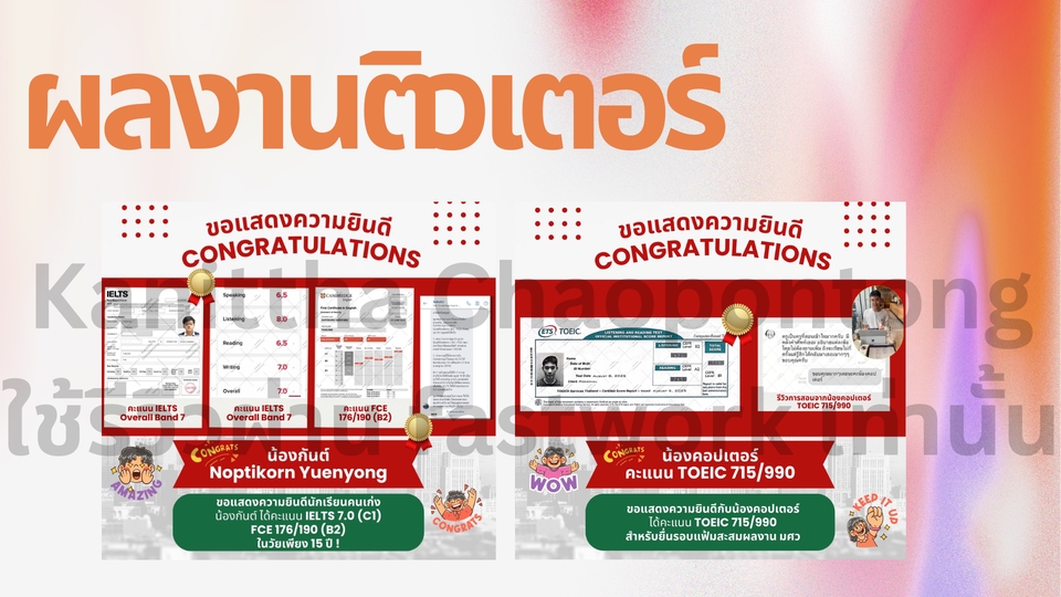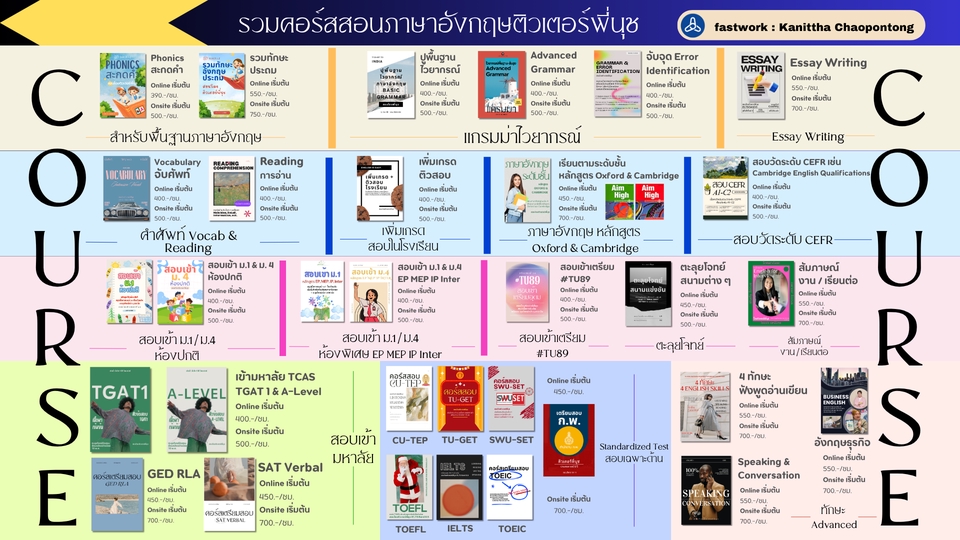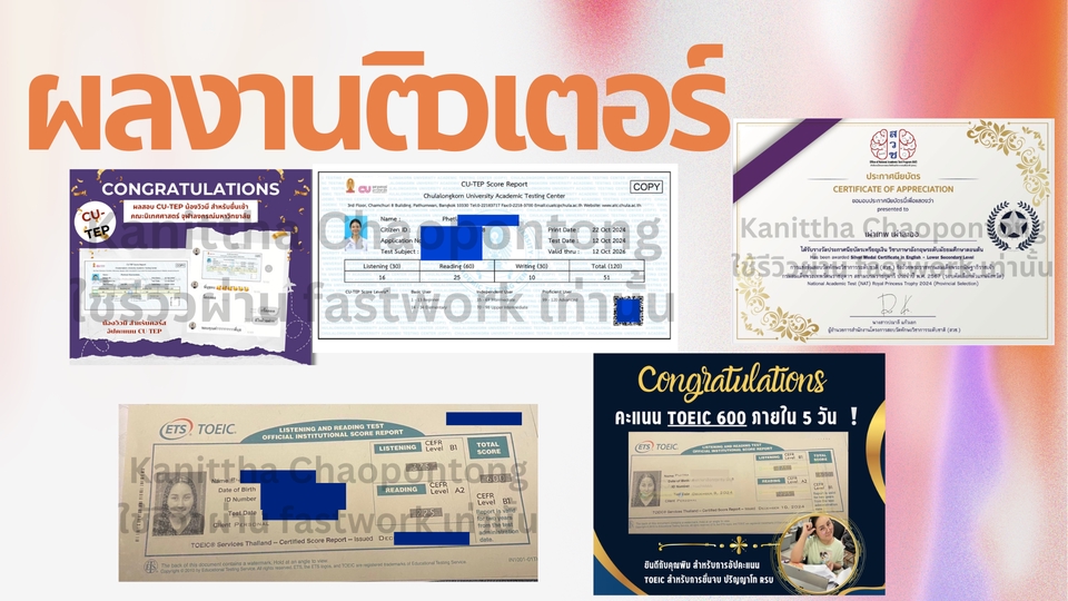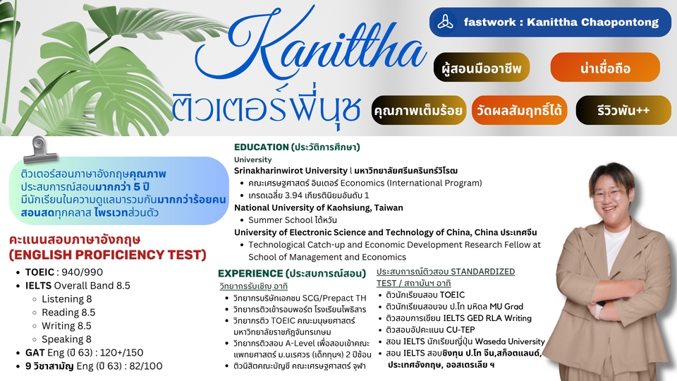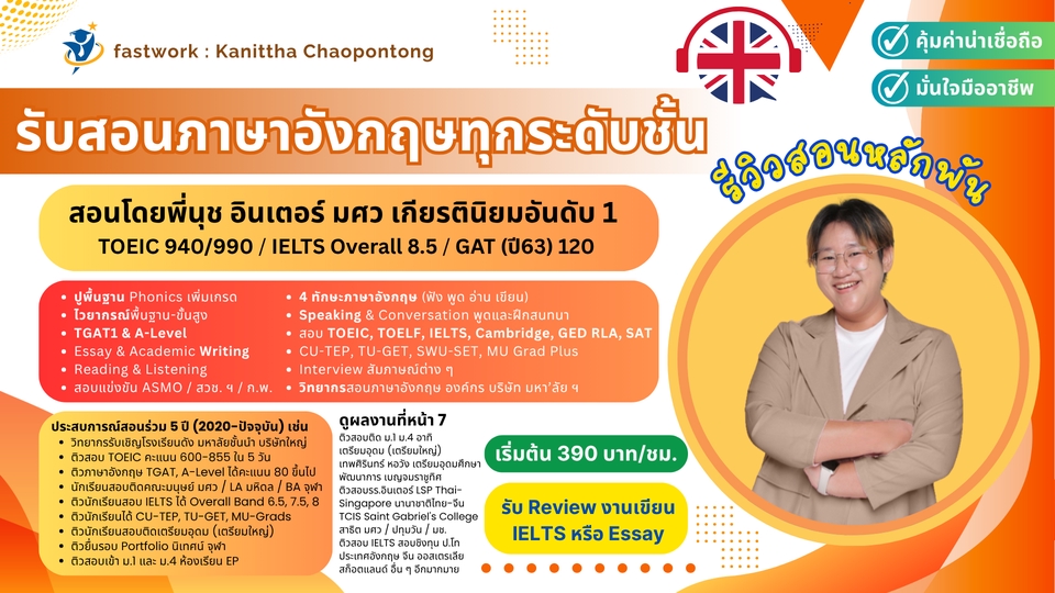 ✨รับสอนภาษาอังกฤษ 📚❗️ปูพื้นฐาน แกรมม่า TGAT A-Level Essay Reading / Writing / Speaking / Listening สนทนา สอน TOEIC IELTS GED CU-TEP SWU-SET ทั้งออนไลน์และสถานที่ในกรุงเทพ 🥇 จุดเด่น ✅ สอนเป็นภาษาอังกฤษล้วนได้หากต้องการ ✅ วัดระดับก่อนสอนเพื่อออกแบบเนื้อหาให้ถูกต้อง ✅ ใจดี ใจเย็น ซื่อสัตย์ สอนสนุกไม่เครียด ✅ มีมาตรฐานวัดผลสัมฤทธิ์ได้ ประวัติการศึกษา - คณะเศรษฐศาสตร์ อินเตอร์ มศว (ประสานมิตร กรุงเทพฯ) เกียรตินิยมอันดับ 1 เกรดเฉลี่ย 3.94 - ภาษาอังกฤษเพื่อการสื่อสารสำหรับหลักสูตรนานาชาติ 1&2: เกรด 4.00 - ทุนแลกเปลี่ยน National University of Kaohsiung (NUK) ประเทศไต้หวัน (2w) และ UESTC ประเทศจีน (5d) - ทุนเรียนดี 3 ปีซ้อน - คะแนน SWU-SET (ปี66) : 76/100 - คะแนน SWU-SET (ปี67) : 88/100 - TOEIC 940/990 - IELTS Band 8.5 - GAT Eng (ปี63): 120+/150 - 9 วิชาสามัญ Eng: 82/100 ประสบการณ์สอนร่วม 5 ปี (2020-ปัจจุบัน) ระดับชั้น ตั้งแต่ ชั้นป.1 - วัยทำงาน - ติวภาษาอังกฤษ TGAT กลุ่มนร.จากสาธิตมศว (ปสม) : คะแนน 80+/100 - ติดคณะมนุษย์ มศว / LA มหิดล / BA จุฬา - ติวนักเรียนสอบ TOEIC ได้คะแนน 855/990 - ติวนักเรียนสอบเข้า เตรียมอุดม (เตรียมใหญ่) - ติว GAT / A-Level นักเรียนทั่วประเทศ - ติวสอบการเขียน IELTS / GED RLA - ติวนิสิตคณะบัญชี และ เศรษฐศาตร์ จุฬา - ติวสอบ สวช เหรียญเงินระดับประเทศ และ ASMOPSS ขั้นตอนการทำงาน 1. ผู้เรียนทักสอบถามเข้ามาทางแชทเพื่อส่งรายละเอียด 2. ผู้สอนสอบถามรายละเอียด เช่น เนื้อหาและจำนวนชั่วโมงที่ต้องการเรียน 3. ผู้สอนออกแบบเนื้อหา Course Syllabus ที่เหมาะสมให้แก่ผู้เรียน 4. ผู้เรียนและผู้สอนตกลง แก้ไข เนื้อหาเพิ่มเติม (ถ้ามี) 5. ส่งเอกสารประกอบการเรียนไฟล์ PDF 6. เข้าเรียนผ่านแพลตฟอร์มที่ตกลงกันไว้ 7. ผู้สอน Records การเรียนเพื่อส่งให้ทบทวนภายหลัง 8. ส่งเอกสารที่จดเนื้อหาเรียบร้อยแล้วให้ผู้เรียนเป็นไฟล์ PDF