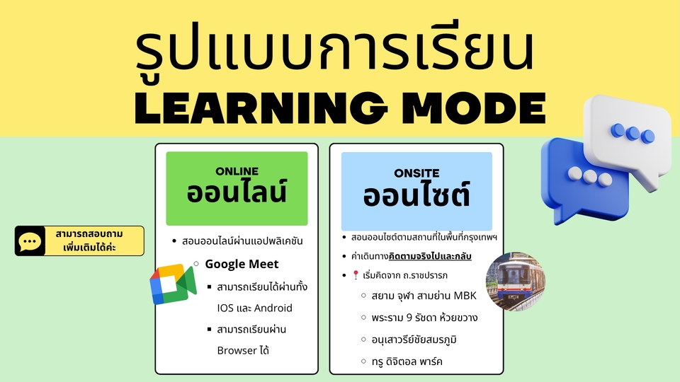 ฿7,000ค่าเรียนเหมาคอร์ส 20 ชั่วโมงเริ่มต้นที่ 7,800.- - ระยะเวลาการสอน 20 ชั่วโมง - ฟรีเอกสารประกอบการ ไม่มีค่าใช้จ่ายเพิ่มเติม - สอนผ่าน Google Meet - มีของสัมนาคุณ หมายเหตุ : ค่าเรียนปรับตามระดับเนื้อหา
