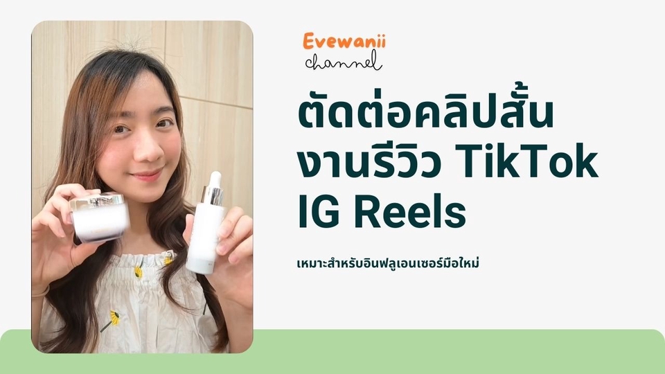 ก่อนหน้านี้เป็นอินฟลูเอนเซอร์รับงานรีวิวใน TikTok ช่อง evewanii ค่ะ เลยมีประสบการณ์ตัดต่อคลิปสั้น 3 ปี สไตล์การตัดต่อคลิปจะเน้นความสนุกทั้งการเคลื่อนไหวของภาพไม่ให้ภาพนิ่งจนเกินไป ให้ความสำคัญกับความหนักเบาของเสียงทั้งเสียงพูด เสียงพื้นหลัง เสียงเอฟเฟค และการใส่เสียงเอฟเฟคที่ไม่ให้เยอะจนน่าเบื่อค่ะ ลูกค้าสามารถเข้าไปดูผลงานเพิ่มเติมได้ที่ TikTok ช่อง evewanii