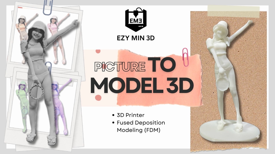 บริการ Picture to Model 3D – EZY MIN 3D เราเชี่ยวชาญในการแปลงรูปถ่ายของคุณให้กลายเป็นโมเดล 3D เสมือนจริง ด้วยเทคโนโลยี FDM 3D Printing งานละเอียด แข็งแรง และคงทน เหมาะสำหรับเก็บเป็นที่ระลึก ของขวัญ หรือการตกแต่งพิเศษ จุดเด่นของเรา ออกแบบจากภาพถ่ายจริง ลูกค้าเลือกท่าทาง/ลักษณะได้ ใช้เครื่องพิมพ์คุณภาพสูง งานละเอียดในทุกมุมมอง ราคาจับต้องได้ ส่งงานตามกำหนด ได้รับไฟล์ 3D + ชิ้นงานจริง เหมาะสำหรับ ของขวัญวันเกิด/รับปริญญา ของสะสมส่วนตัว งานโชว์/โปรเจกต์/นิทรรศการ การเก็บภาพความทรงจำให้อยู่ในรูปแบบที่จับต้องได้