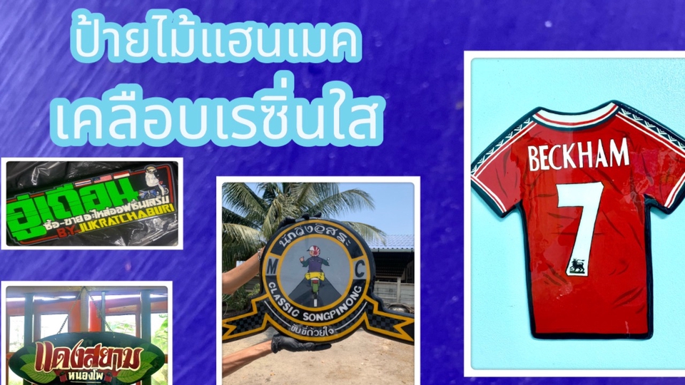 รับทำป้ายไม้งานแฮนเมดวาดมือ เคลือบเรซิ่นใส งานป้ายไม้รูปตัวการ์ตูนต่างๆ ป้ายโลโก้ร้าน โลโก้แบรนด์ตกแต่งห้องนอน ห้องนั่งเล่น ร้านอาหาร คาเฟ่ บาร์เหล้า ฯลฯ ขั้นตอนการทำงาน 1. วาดรูปบนไม้อัดตามขนาดที่เราต้องการ 2. ใช้เลื่อยจิ๊กซอตัดแบบตามที่เราวาดเก็บรายละเอียดขอบมุมให้เรียบร้อย 3. ใช้สีโปสเตอร์ระบายสีตามที่เราวาด 4. ใช้น้ำยาเคลือบเรซิ้นใสที่ผสมแล้วราดให้ทั่วชิ้นงาน 5. รอแห้งเจาะที่แขวนข้างหลังป้าย