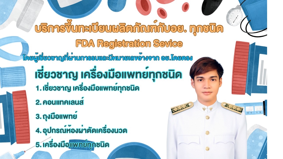 ผู้เชี่ยวชาญด้านการจดทะเบียนเครื่องมือแพทย์และสถานประกอบการกับ อย. มีประสบการณ์กว่า 15 ปี เชี่ยวชาญการจดทะเบียนนำเข้าเครื่องมือแพทย์ทุกประเภท และจดทะเบียนสถานที่ผลิต/เก็บรักษา ให้บริการครบวงจรตั้งแต่ให้คำปรึกษา จัดเตรียมเอกสาร ประสานงานกับ อย. และติดตามจนได้รับใบอนุญาต ช่วยประหยัดเวลาและลดความยุ่งยากในการดำเนินการ พร้อมรับประกันผลงานจนกว่าจะสำเร็จ