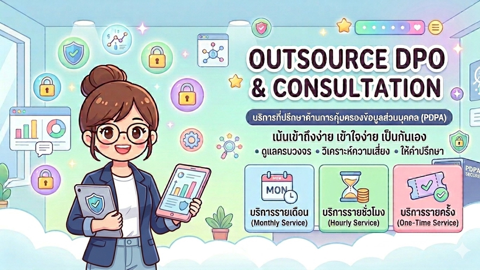 - บริการเป็น DPO ให้แบบ Outsource ดูแล compliance ด้านข้อมูลส่วนบุคคล โดยไม่ต้องจ้างพนักงานประจำ : เริ่มต้น 12,000 บาท / เดือน - ปรึกษาส่วนตัวรายชั่วโมง ถาม-ตอบปัญหา PDPA ได้ตรงจุด เข้าใจง่าย และใช้ได้จริง : เริ่มต้น 2,000 บาท / ชั่วโมง