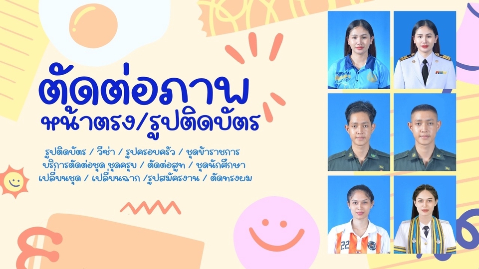 รับตัดต่อภาพหน้าตรง รูปติดบัตร ชุดนักเรียน ชุดนักศึกษา ชุดข้าราชการ ชุดครุย ชุดทำงาน ขั้นตอนง่ายๆ ส่งรูปหน้าตรง โดยให้ถ่ายรูปตนเองบริเวณที่สว่างและพื้นหลังสีเดียว เช่นสีขาว แจ้งขนาด และ ชุดที่ต้องการให้ตัดต่อ ขั้นตอนการทำงาน 1. แจ้งรายละเอียดงาน 2. ลูกค้าถ่ายรูปตนเองส่งมาให้ 3. ทางร้านตัดต่อและส่งให้ลูกค้าตรวจสอบ 4. ส่งไฟล์ภาพ พร้อมพิมพ์ภาพส่งทางไปรษณีย์