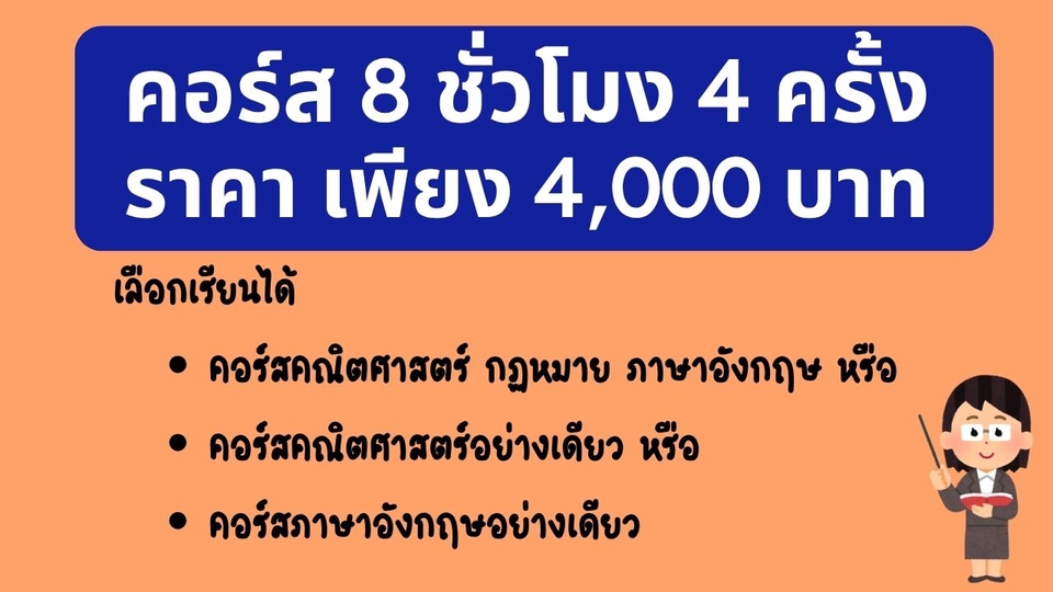 ฿4,000สามารถเลือกวิชาที่ติวได้ 1 แบบจาก 3 แบบ คือ 1. คณิตศาสตร์ กฎหมาย ภาษาอังกฤษ 2. คณิตศาสตร์ อย่างเดียว 3. ภาษาอังกฤษ อย่างเดียว เรียนสด สรุปเนื้อหาสำคัญ พร้อมตัวอย่างข้อสอบ