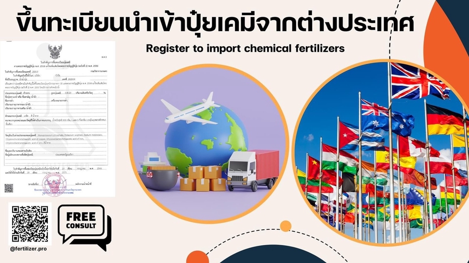 มีประสบการณ์การขึ้นทะเบียนนำเข้าปุ๋ยเคมีจากต่างประเทศและภายในประเทศมากกว่า500++ทะเบียน เชี่ยวชาญด้านเอกสารเกี่ยวกับการผลิตปุ๋ย และการขึ้นทะเบียนปุ๋ยกับกรมวิชาการเกษตรทุกประเภท บริการครบวงจนตั้งแต่จดเครื่องหมายการค้า ถึงนำเข้าปุ๋ยเคมีจากต่างประเทศ ขั้นตอนการทำงาน 1. ลูกค้าส่งรายละเอียดข้อมูลงานที่ต้องการรับบริการ 2. แจ้งลูกค้าเตรียมเอกสารและตรวจสอบเอกสาร 3. ยื่นเอกสารกับหน่วยงานราชการที่เกี่ยวข้อง 4. รอเจ้าหน้าที่ตรวจเอกสาร 5. หน่วยงานที่เกี่ยวข้องออกใบอนุญาต 6. ส่งใบอนุญาตให้ลูกค้า