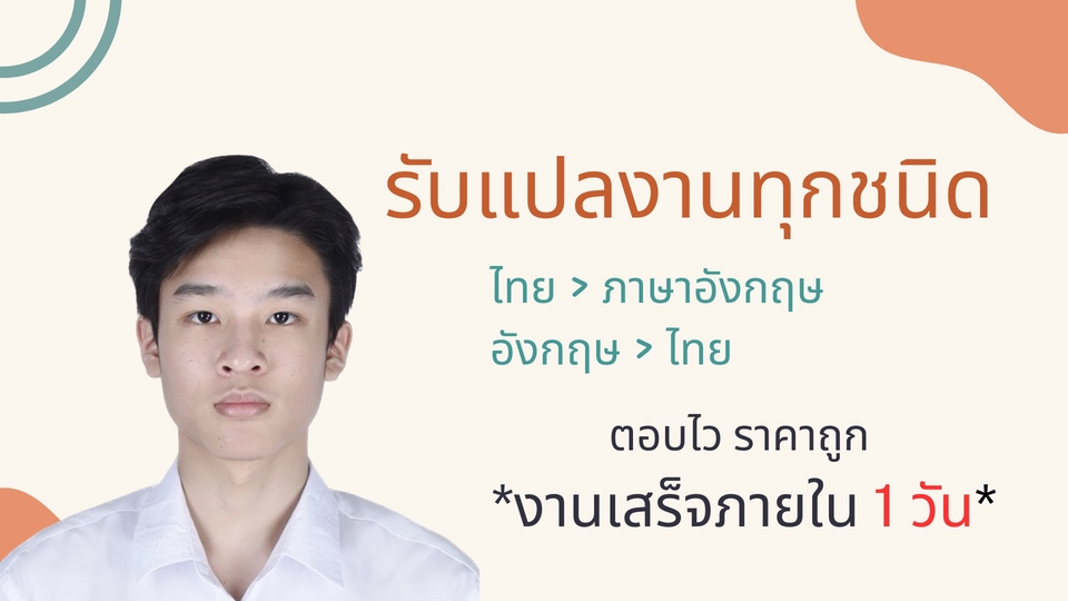 รับทำทุกสารพัดอย่างในราคาเป็นกันเองครับ -รับแปล Essay ทุกหัวข้อ -รับแปลเอกสารต่างๆ -รับแปลสื่อการเรียนการสอน ถ้าสนใจสอบถามลายระเอียดทักแชทมาได้เลยครับ ขั้นตอนการทำงาน 1. แจ้งรายละเอียดงาน 2. ตกลงราคาเเละวันส่งงาน 3. เริ่มการแปล 4. คืนงานทุกชิ้นก่อนหมด 24 ชม