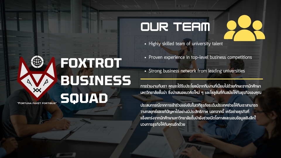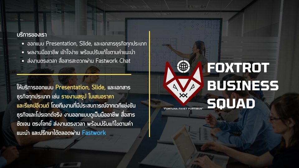 ทีมฟรีแลนซ์สายธุรกิจจากมหาวิทยาลัยชั้นนำ ให้บริการแปลภาษา งานเอกสารธุรการ ออกแบบพรีเซนต์ และวางแผนธุรกิจ ด้วยประสบการณ์แข่งขันธุรกิจและโปรเจกต์จริง พร้อมความคล่องตัว ใส่ใจในรายละเอียด รับงานทั้งออนไลน์และออนไซต์ (ในเขตกรุงเทพฯ) F.B.S – Tactical Minds. Strategic Moves.