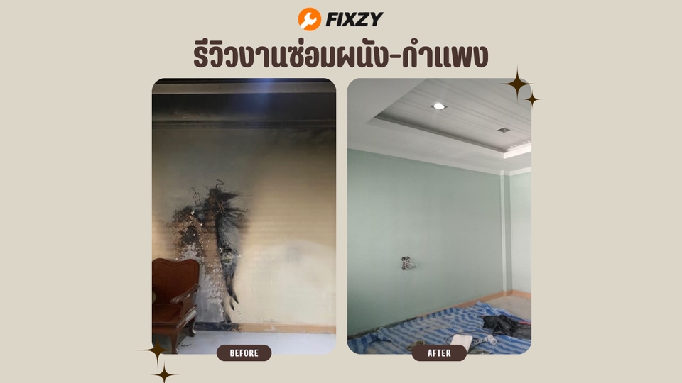 • รอยร้าว เก็บงานผนัง ฉาบผนัง ทำผนังใหม่ 1. เข้าตรวจสอบบริเวณที่ต้องการแก้ไข 2. ตรวจสอบพื้นที่และวัดขนาดเพื่อใช้ในการประเมินราคา 3. ตรวจเช็คเฉดสี 4. วิเคราะห์และประเมินราคา มีบริการทั้งค่าแรงอย่างเดียว และบริการค่าแรงพร้อมกับซื้อของ คุณลูกค้าสามารถแจ้งความต้องการกับทาง Fixzy ได้เลย หรือสามารถสอบถามข้อมูลเพิ่มเติมก่อนรับบริการได้ ขั้นตอนการทำงาน 1. ลูกค้าเลือกแพ็กเกจที่ต้องการ และตรวจสอบพื้นที่ให้บริการของแพ็กเกจนั้นๆว่าลูกค้าอยู่ในพื้นที่ที่กำหนดหรือไม่ 2. แจ้งรายละเอียดเกี่ยวกับแพ็กเกจเพิ่มเติม เช่น ที่อยู่ ขนาด พื้นที่รองรับการให้บริการ อายุการใช้งาน เป็นต้น 3. Fixzy ตรวจสอบรายละเอียดพร้อมพื้นที่ว่าตรงกับเงื่อนไขการให้บริการหรือไม่ พร้อมประเมินราคา 4. แจ้งวันที่สะดวกรับบริการกับ FIxzy โปรดจองล่วงหน้าอย่างน้อย 5 วัน 5. Fixzy จะตรวจสอบคิวกับทางผู้ให้บริการบนระบบก่อนทุกครั้ง หากได้คิวตามที่ลูกค้าต้องการ Fixzy จะทำการคอนเฟิร์มคิวกลับไป แต่หากไม่มีคิวตามที่ลูกค้าต้องการ Fixzy จะทำการขอคิวที่เร็วที่สุดกับทางผู้ให้บริการมาและสอบถามลูกค้าอีกครั้ง จนกว่าจะได้วันที่ลูกค้าและผู้ให้บริการสะดวกตรงกัน 6. หากเข้าเงื่อนไข Fixzy จะทำการสร้างใบเสนอราคาและส่งไปยังลูกค้า 7. หากลูกค้ามีความประสงค์จะชำระเงินในนามบริษัท หรือต้องการใบเสร็จ/ใบกำกับภาษี โปรดแจ้งเจ้าหน้าที่ก่อนออกใบเสนอราคาทุกครั้ง 8. ลูกค้าพิจารณาราคา และชำระเงินตามใบเสนอราคา 9. หลังจากลูกค้าชำระเงินเรียบร้อยแล้ว รอผู้ให้บริการเข้าให้บริการตามนัดหมายได้เลย ก่อนถึงเวลานัดหมาย จะมีผู้ให้บริการโทรคอนเฟิร์มนัดหมายอย่างน้อย 1 ชั่วโมงก่อนถึงเวลานัด