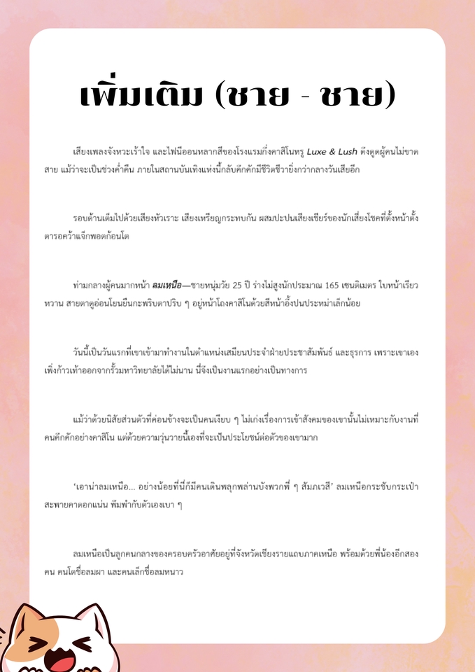 รับจ้างงานเขียนอิสระได้หลากหลายแนว ไม่ว่าจะเป็นแนวย้อนยุค, Period, จีน, โลกอนาคต, Sci-fi, Fantasy, สืบสวนสอบสวน, สยองขวัญ, ฯลฯ รับงานเขียนทั้งชาย-ชาย, ชาย-หญิง, และ หญิง-หญิง มีความยืดหยุ่นต่องานและตรงต่อเวลา ขั้นตอนการทำงาน 1. รับบรีฟจากลูกค้า 2. ตกลงเรื่องราคาและรายละเอียดงาน 3. เริ่มการทำงานตามระยะเวลาที่กำหนด 4. ส่งดราฟแรกให้ลูกค้า 5. หากไม่มีอะไรแก้ไข จะส่งไฟล์งานให้กับลูกค้าทางemail 6. จบงาน