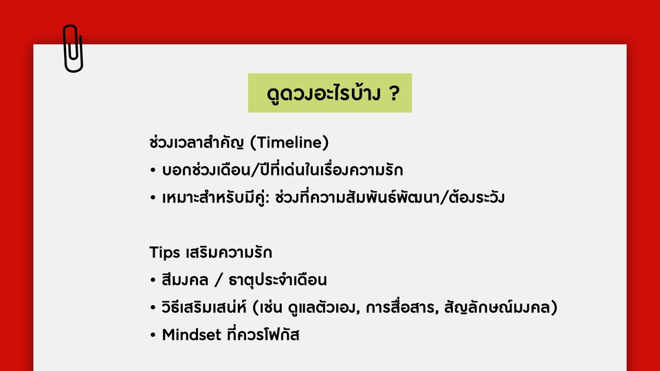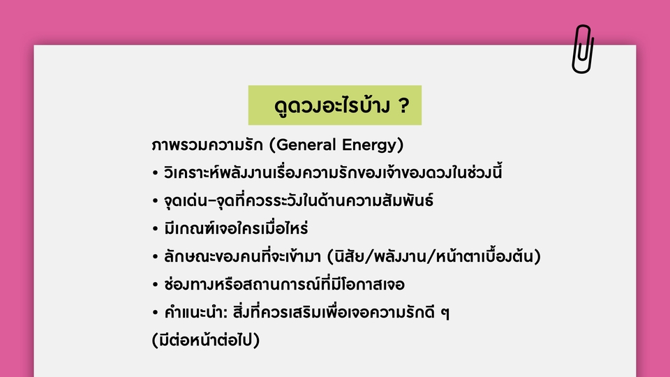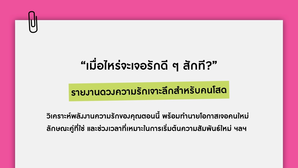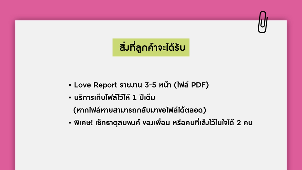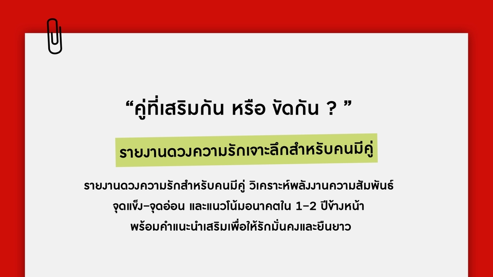 ✨ “เมื่อไหร่จะเจอรักดี ๆ สักที?” ✨ รายงานดวงความรักเจาะลึกสำหรับคนโสด วิเคราะห์พลังงานความรักของคุณตอนนี้ พร้อมทำนายโอกาสเจอคนใหม่ ลักษณะคู่ที่ใช่ และช่วงเวลาที่เหมาะในการเริ่มต้นความสัมพันธ์ใหม่ สิ่งที่จะได้ดูภาพรวมความรัก (General Energy) • วิเคราะห์พลังงานเรื่องความรักของเจ้าของดวงในช่วงนี้ • จุดเด่น–จุดที่ควรระวังในด้านความสัมพันธ์ • มีเกณฑ์เจอใครเมื่อไหร่ • ลักษณะของคนที่จะเข้ามา (นิสัย/พลังงาน/หน้าตาเบื้องต้น) • ช่องทางหรือสถานการณ์ที่มีโอกาสเจอ • คำแนะนำ: สิ่งที่ควรเสริมเพื่อเจอความรักดี ๆ ช่วงเวลาสำคัญ (Timeline) • บอกช่วงเดือน/ปีที่เด่นในเรื่องความรัก • เหมาะสำหรับโสด: ช่วงเจอคนใหม่ Tips เสริมความรัก • สีมงคล / ธาตุประจำเดือน • วิธีเสริมเสน่ห์ (เช่น ดูแลตัวเอง, การสื่อสาร, สัญลักษณ์มงคล) • Mindset ที่ควรโฟกัส 📄 สิ่งที่จะได้รับ • Love Report รายงาน 3-5 หน้า (ไฟล์ PDF) • บริการเก็บไฟล์ไว้ไห้ 1 ปีเต็ม หากไฟล์หายสามารถกลับมาขอไฟล์ได้ตลอด • พิเศษ! เช็กธาตุสมพงศ์ ของเพื่อน หรือคนที่เล็งไว้ในใจได้ 2 คน คู่แท้ หรือ คู่ทดสอบ?” 💖 รายงานดวงความรักสำหรับคนมีคู่ วิเคราะห์พลังงานความสัมพันธ์ จุดแข็ง–จุดอ่อน และแนวโน้มอนาคตใน 1–2 ปีข้างหน้า พร้อมคำแนะนำเสริมเพื่อให้รักมั่นคงและยืนยาว (ตามศาสตร์ Bazi เพื่อดูพลังงาน เเละถ้าขัดกันควรเสริมอะไร) ภาพรวมความรัก (General Energy) • วิเคราะห์พลังงานเรื่องความรักของเจ้าของดวงในช่วงนี้ • จุดเด่น–จุดที่ควรระวังในด้านความสัมพันธ์ • สถานะความสัมพันธ์ปัจจุบัน (พลังงานคู่, จุดแข็ง–จุดอ่อน) • คู่ที่เสริมกันหรือขัดกัน • แนวโน้มความสัมพันธ์ในอนาคต (1–2 ปีข้างหน้า) • สิ่งที่ควรระวัง (การสื่อสาร, การเงิน, ครอบครัว ฯลฯ) • คำแนะนำวิธีปรับเพื่อให้รักยืนยาว • ช่วงเวลาสำคัญ (Timeline) • บอกช่วงเดือน/ปีที่เด่นในเรื่องความรัก • เหมาะสำหรับมีคู่: ช่วงที่ความสัมพันธ์พัฒนา/ต้องระวัง Tips เสริมความรัก • สีมงคล / ธาตุประจำเดือน • วิธีเสริมเสน่ห์ (เช่น ดูแลตัวเอง, การสื่อสาร, สัญลักษณ์มงคล) • Mindset ที่ควรโฟกัส 📄 ได้รับเป็น Couple Report (PDF) ✨ บริการเก็บไฟล์ไว้ไห้ 1 ปีเต็ม หากไฟล์หายสามารถกลับมาขอไฟล์ได้ตลอด