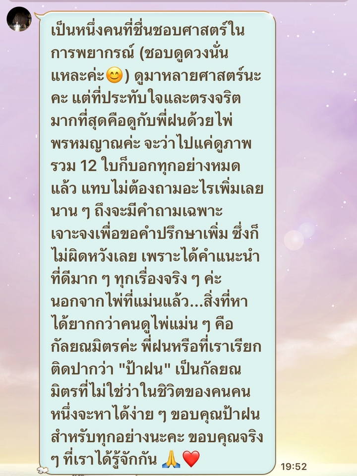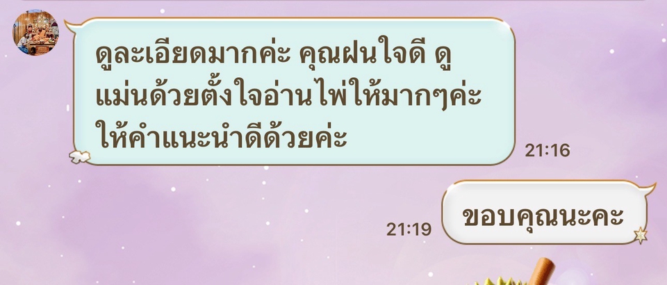 แม่ฝนมีประสบการณ์ดูดวงมากกว่า 16 ปี ด้วยศาสตร์ไพ่พรหมญาณ ผสานการวิเคราะห์ตัวเลขสำคัญในชีวิต เช่น บัตรประชาชน วันเดือนปีเกิด เลขทะเบียนรถ เลขที่บ้าน และเบอร์โทรศัพท์ เพื่อให้คำแนะนำที่ชัดเจน เข้าใจง่าย และนำไปใช้ได้จริง เหมาะสำหรับผู้ที่ต้องการแนวทางชีวิตในด้านความรัก การงาน การเงิน ครอบครัว หรือคำถามเฉพาะทางที่กำลังเผชิญ ให้บริการ 3 แพ็กเกจให้เลือกตามความต้องการ แพ็กเกจ 599 บาท ดูดวงครบวงจร ทั้งไพ่และวิเคราะห์ตัวเลข พร้อมถามได้ 5 คำถาม แพ็กเกจ 299 บาท ดูไพ่พรหมญาณ ถามได้ 3 คำถาม (ไม่รวมวิเคราะห์ตัวเลข) แพ็กเกจ 100 บาท สำหรับคำถามเร่งด่วน ถามได้ 1 คำถาม ทุกคำทำนายมาพร้อมความจริงใจ นุ่มนวล และแนะแนวให้คุณเห็นทางออกที่เหมาะสมกับตัวเองที่สุด ตอนนี้มีคูปองส่วนลดจาก Fastwork ลดทันที 50% ลดได้สูงสุด 100 บาท เท่ากับว่าแพ็กเล็กสุด ลูกค้าสามารถทดลองดูดวงได้ในราคา 50 บาทเลยนะคะ สามารถดูรีวิวของลูกดวงในอัลบั้มเพื่อประกอบการติดสินใจได้เลยนะคะ ขั้นตอนการทำงาน 1. ลูกค้าส่งข้อมูลและคำถามที่ต้องการ 2. วิเคราะห์ข้อมูลและตรวจสอบพลังงาน (ไพ่/ตัวเลข ตามแพ็กเกจ) 3. เปิดไพ่และพยากรณ์ พร้อมตอบคำถามอย่างชัดเจน 4. สรุปคำแนะนำและส่งผลลัพธ์ภายใน 1 วัน