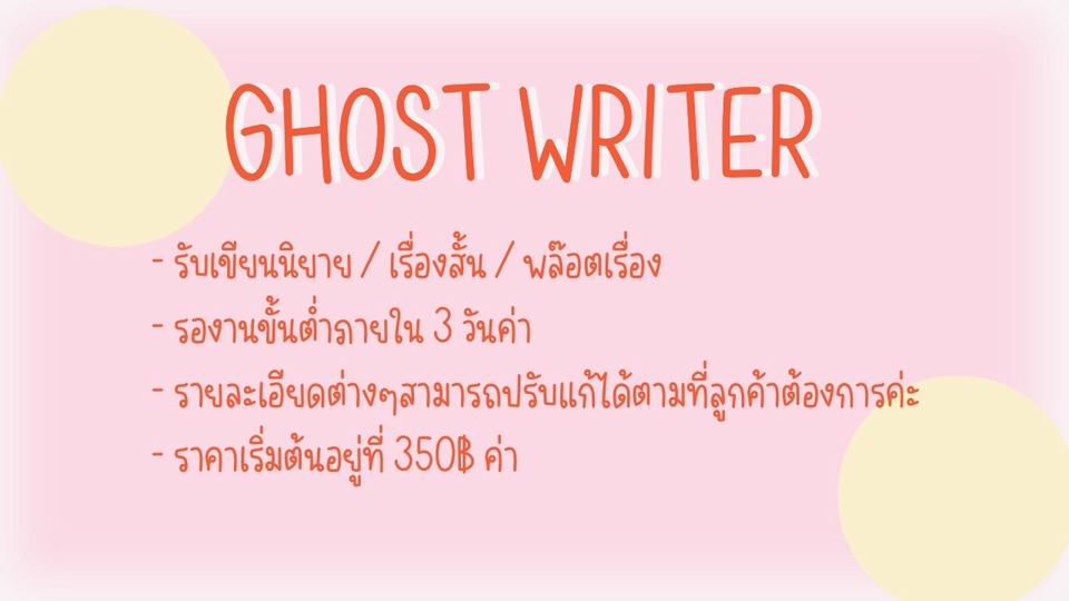 รับเขียนนิยาย / เรื่องสั้น รวมไปถึงแต่งพล๊อตเรื่องค่ะ รับทุกแบบไม่ว่าจะเป็น BL / GL / ออริ / รวมไปถึงพวก Verse ต่างๆก็รับค่ะ **ไม่รับงานที่ขัดต่อศีลธรรมทั้งสิ้นค่ะ** ลูกค้าตกลงเริ่มงาน พร้อมแจ้งแนวทางของเรื่องตามที่อยากได้ (หากมีพล๊อตเรื่องอยู่แล้วสามารถส่งมาได้ค่ะ) หลังชำระเงิน จะเริ่มงานให้ในทันที ทั้งนี้ลูกค้าสามารถสอบถามใน chat ถึงความคืบหน้าของงานได้เสมอ เมื่อเสร็จ จะส่งงานให้ลูกค้าได้ตรวจเช็ค ซึ่งสามารถแก้ไขได้ไม่เกิน 3 ครั้งค่ะ