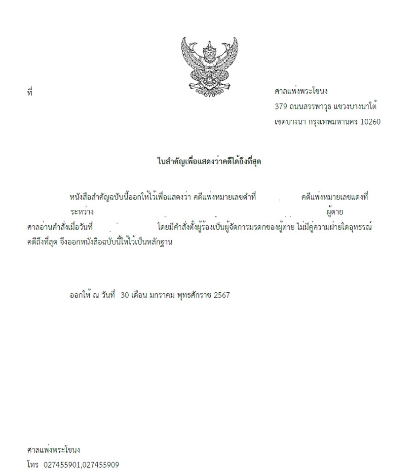 - • หนังสือรับรองคดีถึงที่สุดจากศาล 1 ฉบับ