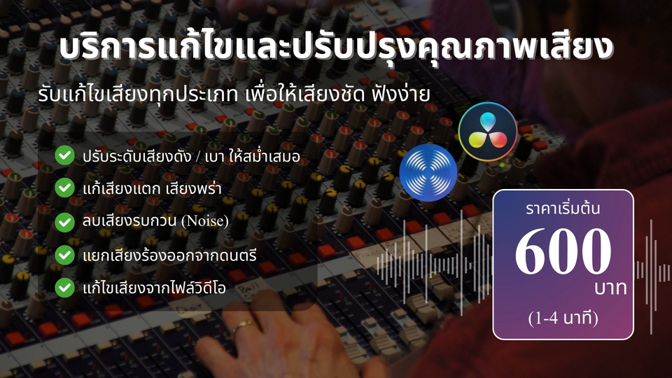 ฿600บริการแก้ไขและปรับปรุงคุณภาพเสียงขั้นพื้นฐาน ปรับระดับเสียงให้สม่ำเสมอ ลดเสียงรบกวนทั่วไป แก้เสียงแตกและเสียงพร่า สำหรับงานความยาว 1–4 นาที