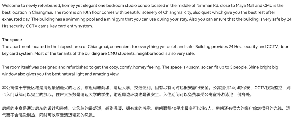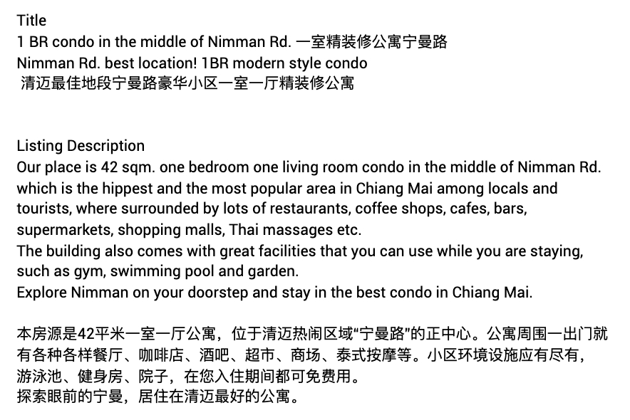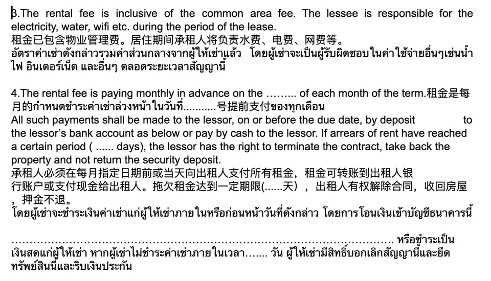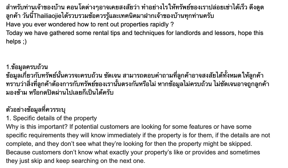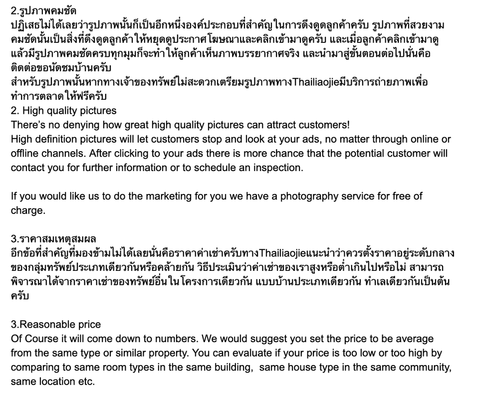 -รับแปลเอกสารประเภทต่างๆเช่นบทความ โบร์ชัวร์ เว็บไซต์ จดหมายแนะนำตัว เรซูเม่ สัญญาว่าจ้าง สัญญาเช่าบ้าน สัญญาซื้อขายบ้าน ข้อความโฆษณา และอื่นๆ -ข้อความสนทนาต่างๆเช่น ตอบemail ตอบWechat Taobao และอื่นๆ สามารถแปลได้3ภาษาเช่น ไทย>อังกฤษ ไทย>จีน อังกฤษ>ไทย อังกฤษ>จีน จีน>ไทย จีน>อังกฤษ เนื้อหาที่เชี่ยวชาญ -อสังหาริมทรัพย์ -การท่องเที่ยว -การโรงแรม ขั้นตอนการทำงาน 1. รับเนื้อหาจากลูกค้าเพื่อประเมินราคางานและระยะเวลาที่ใช้ในการทำงาน 2. เสนอราคาและแจ้งระยะเวลาที่ใช้ในการทำงานแก่ลูกค้า 3. ลูกค้าชำระเงิน 4. ดำเนินการแปลงาน 5. ส่งงานให้ลูกค้า 6. แก้ไขงาน(หากมี) 7. ลูกค้าเขียนรึวิวผลงานและความพึงพอใจ