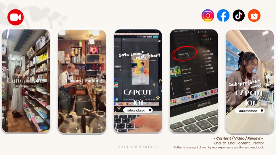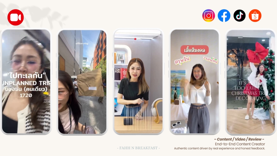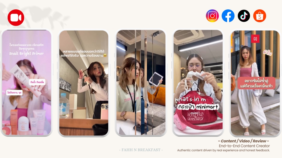 🎥 Creative VDO Content / KOL–KOC Content / Content Creator รับสร้างโพสต์ วิดีโอคอนเทนต์ รีวิวสินค้า ปักตระกร้าา ไลฟ์สไตล์ สำหรับแบรนด์ "End-to-End Content Creator" Authentic content based on real experience & real feedback สวัสดีค่ะ 😊 FAHH ค่ะ Content Creator ที่ทำงานโดยผสานมุมมอง Digital Marketing & Strategy :: รับผลิต Social Content & Product Review :: สำหรับทั้ง SMEs / Brand / Professional Brand เหมาะตั้งแต่แบรนด์ที่เพิ่งเริ่มทำคอนเทนต์ ไปจนถึงแบรนด์ที่ต้องการรีวิวสินค้าอย่างมีทิศทาง และใช้งานต่อได้จริง _____________________________________________ สิ่งที่แบรนด์จะได้ ✔️ เพิ่มการรับรู้แบรนด์ (Awareness) ✔️ เข้าถึงกลุ่มลูกค้าได้ง่าย ผ่านคอนเทนต์ที่ดูเป็นธรรมชาติ ✔️ ใช้งานได้จริงบนทุกแพลตฟอร์มโซเชียล ✔️ ปรับรูปแบบคอนเทนต์ให้เหมาะกับ Objective และภาพลักษณ์ของแบรนด์ ⚡ แนวคอนเทนต์เน้น Lifestyle & Product Review อิงจาก ประสบการณ์ใช้งานจริง + feedback แบบผู้ใช้จริง ไม่ Hard sell (หรือปรับให้ขายชัดขึ้นได้ตามความต้องการของแบรนด์) 📍 เหมาะสำหรับ: Brand Content / Lifestyle Content / KOL–KOC / Barter Campaign _____________________________________________ 💡 แนวทางคอนเทนต์ที่ถนัด ▪️ Brand content ▪️ Lifestyle content ▪️ Product review ▪️ Trend-driven edits _____________________________________________ 🎬 รูปแบบงาน (Content Type) ▪️ Video / Reels / Shorts Short-form Content ที่ต้องการสื่อสารไว เข้าใจง่าย และปรับใช้ได้ทั้ง Organic และ Ads 💡 ความยาววิดีโอ ▪️ 15 sec: Hook / Viral / Ads Creative เน้นดึงความสนใจในช่วงต้น ▪️ 30 sec: เล่า Feature หรือ การใช้งาน / ติดตะกร้าสินค้า / บอกโปรโมชั่น / ชวนติดตามแคมเปญ ▪️ 60 sec: Review / Storytelling เหมาะกับการอธิบายประสบการณ์ใช้งานจริง ▪️ 90 sec: Narrative / Campaign Content ใช้เล่าเรื่องแบรนด์หรือแนวคิดของแคมเปญ _____________________________________________ 🛒 Social Content & Product Review เหมาะกับหมวดสินค้า Lifestyle | Skincare | Beauty | Pet | Gadget Home & Living | Food & Beverage | Hotel & Travel _____________________________________________ 📦 สิ่งที่รวมในบริการ ▪️ Online Briefing 1 ครั้ง (20 นาที) เพื่อกำหนด Scope of Work ▪️ คอนเทนต์ตามรูปแบบที่ตกลง (Photo / Video / Post) ▪️ เปิดให้แก้ไขงานหรือปรับแคปชัน 3 ครั้ง ▪️ สามารถพูดคุย Barter Package ได้ (ขึ้นอยู่กับสินค้าและรูปแบบงาน) 🛠 อุปกรณ์ & การทำงาน ▪️ iPhone 17 Pro / Iphone 13 Pro ▪️ Mirrorless Camera ▪️ โปรแกรม: CapCut Pro / Canva Pro ▪️ Mic: Hollyland All-in-One Production ▪️ Storyboard / Mood & Tone ▪️ Reference Video ▪️ Dialog + Key Message ▪️ Voice-over / Subtitle / Super ▪️ Background Music ลิขสิทธิ์ถูกต้องสำหรับ Commercial (จาก CapCut / TikTok Library) 🧾 ขั้นตอนการทำงาน; 1. แบรนด์แจ้งเป้าหมาย แพลตฟอร์ม และรูปแบบคอนเทนต์ 2. Online Briefing (20 mins) เพื่อสรุป - Scope of Work - Mood & Tone / Reference จากทางแบรนด์ - Key Message 3. วางแผนไทม์ไลน์ - Brief: key message / hasgtag / location - Storyboard - ถ่ายทำ - ตัดต่อ - วันส่งงาน / วันโพสต์ - ลูกค้าจัดส่งสินค้าเพื่อถ่ายทำ 4. ถ่ายทำ - Home studio หรือตาม lifestyle content ที่ตกลงกัน - หากถ่ายทำนอกสถานที่ มีค่าใช้จ่ายเพิ่มเติมตามที่ตกลง** และระยะเวลาไม่เกิน 4 ชั่วโมง (ครึ่งวัน) - ส่งงาน Draft ให้ตรวจสอบ - ปรับแก้ตามแพ็กเกจ - ส่ง Final Content พร้อมใช้งาน ผ่าน google drive ⏱ ระยะเวลาในการทำงาน - ส่งงาน Draft ภายใน 5-7 วันทำการ หลังได้รับสินค้า หรือตามที่ตกลงไทม์ไ