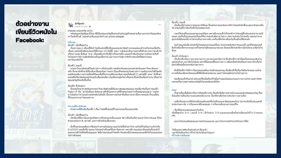 - เขียนบทความหรือแคปชันสำหรับสื่อออนไลน์ เช่น หน้า Website, เพจ Facebook, Instagram - เกี่ยวกับการรีวิว/พรีวิว/วิเคราะห์/สปอย ภาพยนตร์ ซีรีส์ หรือเขียนถึง Topic อื่น ๆ ที่ลูกค้าต้องการ - สามารถเขียนได้ทั้งในรูปแบบกึ่งทางการ/เป็นกันเอง/เบาสมอง ได้ - สามารถทักมาสอบถามก่อนได้เลย นักเขียนเป็นกันเองมากถึงมากที่สุด ขั้นตอนในการทำงาน 1. พูดคุยกับลูกค้าเกี่ยวกับหัวข้อและขอบเขตของเนื้อหาอย่างละเอียด 2. เริ่มเขียนบทความ 3. ส่งงานให้ลูกค้าตรวจสอบงาน 4. นำ Feedback ที่ได้มาปรับแก้ไข (สามารถแก้ไขได้ฟรี 3 ครั้ง) 5. ส่งงานครั้งสุดท้ายให้ลูกค้า ราคาอาจะมีการเปลี่ยนแปลง ขึ้นอยู่กับรูปแบบของงานและเนื้อหาที่เขียน ขั้นตอนการทำงาน 1. พูดคุยกับลูกค้าเกี่ยวกับหัวข้อและขอบเขตของเนื้อหาอย่างละเอียด 2. เริ่มเขียนบทความ 3. ส่งงานให้ลูกค้าตรวจสอบงาน 4. นำ Feedback ที่ได้มาปรับแก้ไข (สามารถแก้ไขได้ฟรี 3 ครั้ง) 5. ส่งงานครั้งสุดท้ายให้ลูกค้า