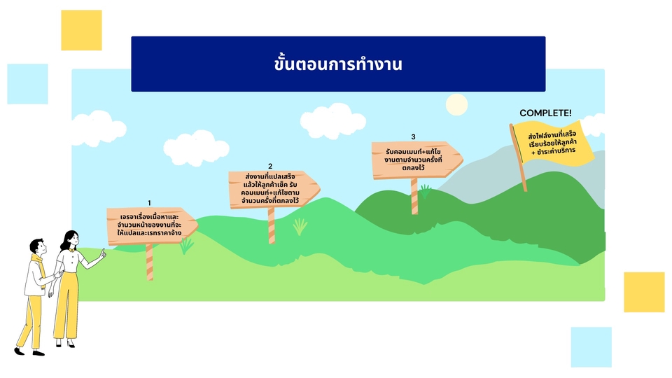 เคยเป็นนักเรียนแลกเปลี่ยนที่ประเทศสหรัฐอเมริกาเป็นเวลา 1 ปี เคยสอบ IELTS ได้คะแนน 7.0 มีประสบการณ์แปลบทความสั้นและบทหนังสั้นประกวดมาก่อน มั่นใจในฝีมือและคุณภาพได้ค่ะ ขั้นตอนการทำงาน 1. เจรจาเรื่องรายละเอียดเนื้อหางานที่จะให้แปล 2. เจรจาเรื่องเรทราคาค่าบริการ และชำระค่าบริการ 3. ส่งไฟล์งานดราฟท์แรกให้ลูกค้าตรวจเช็ค 4. รับคอมเมนท์และแก้ไขตามที่ลูกค้าแจ้ง 5. แก้ไขชิ้นงานตามจำนวนที่ตกลงกันไว้ 6. หากลูกค้าพอใจกับผลงานแล้ว จะทำการส่งไฟล์ต้นฉบับให้ลูกค้า