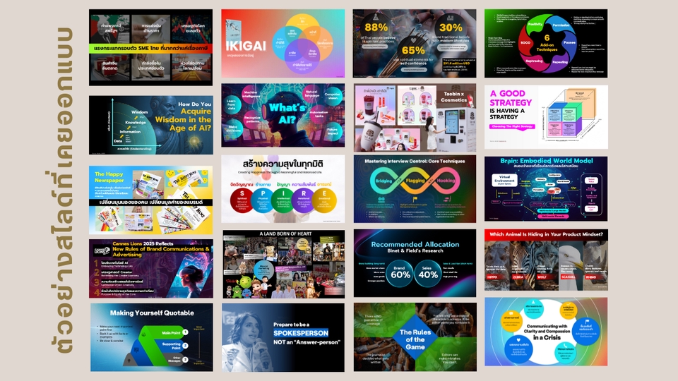 สอนทำสไลด์เน้น Visual สวย คม ชัด ดูแพง ผ่านประสบการณ์ออกแบบสไลด์ระดับผู้บริหารและงานเวทีองค์กร 🔹 สำหรับมือใหม่ - แนะนำเมนูและเครื่องมือใน PowerPoint - วิธีแทรกข้อความ, รูปภาพ, ตาราง, กราฟ - การใช้ Slide Master และ Template เบื้องต้น - Shortcut และเทคนิคใช้งานให้เร็วขึ้น 🔹 สำหรับคนที่ใช้งานเป็นแล้ว - หลักการ Visual Design สำหรับสไลด์ - การจัดวาง Layout, ฟอนต์, และโทนสี - การทำ Infographic / Diagram ใน PowerPoint - เทคนิคทำสไลด์ให้ดูโปร ใช้งานได้จริงในงานองค์กร - ตัวอย่างสไลด์จริงจากงานผู้บริหาร 🎯 วิธีการเรียน: - สอนออนไลน์ (Zoom / Google Meet) 🧑💻 สิ่งที่จะได้ - ออกแบบสไลด์เองได้แบบสวยระดับมืออาชีพ - ไอเดียเลย์เอาท์พร้อมใช้ - เคล็ดลับการเลือกภาพ/สี/ฟอนต์ให้ตรงกับ Mood & Tone 💡 เหมาะสำหรับ - คนที่อยากทำสไลด์ “สวยและขายงานได้” - พนักงาน/นักศึกษาที่ต้องส่งงานให้ดูโดดเด่น - ฟรีแลนซ์ที่อยากรับงานทำสไลด์จริง