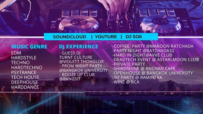 ประสบการณ์ดีเจมากกว่า 8 ปี Genre ที่ถนัด : Hard Techno / PsyTrance / Hardstyle / Hard Dance / Techno Genre รอง : Tech House / Deep House / Dubstep / DnB อัทยาศัยดี อารมณ์ดี เอนจอยกับการเปิดเพลง มีเครื่อง ไฟ ลำโพงให้สำหรับ งาน Private ยินดีให้บริการ พร้อมสนุกไปด้วยคร้าบบ ขั้นตอนการทำงาน 1. รับบรีฟรายละเอียดงานจากลูกค้า แนวเพลง สถานที่ เวลา 2. โชว์สถานที่และวัน เวลาที่ตกลงกันไว้
