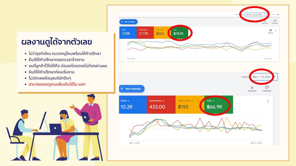 ฿5,000ลูกค้าจะได้ report พร้อมคำอธิบายแบบเจาะลึกสำหรับ Ads ที่ลูกค้ายิง พร้อมกับ แนะนำ Trend และ งบสำหรับธุกิจของลูกค้า สามารถทำควบคู่กับ Digital Platform อืนๆ ให้ผลลับของลูกค้า เข้าถึงยอดได้สูงที่สุด พร้อมดูแลตลอด 1 เดือน + ติดตั่ง Conversion และ Google Tag เพื่อให้ AI คำนวนลูกค้าแต่ละราย