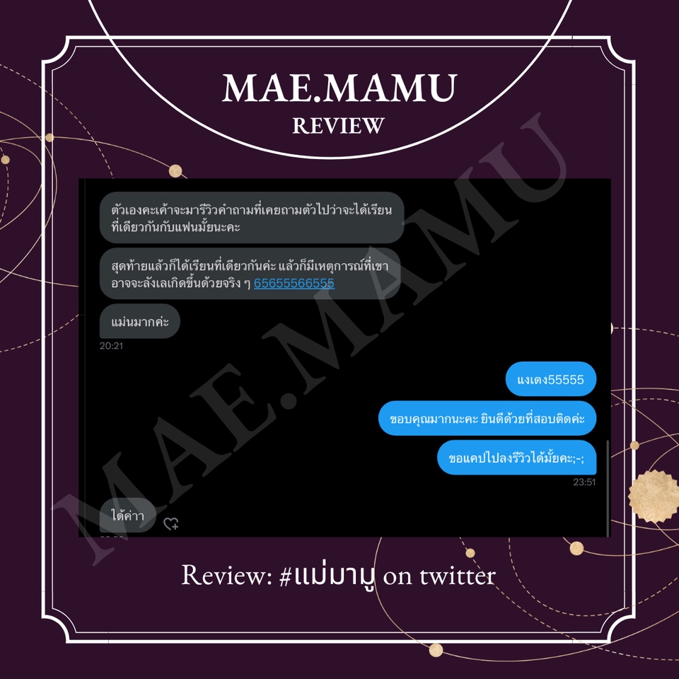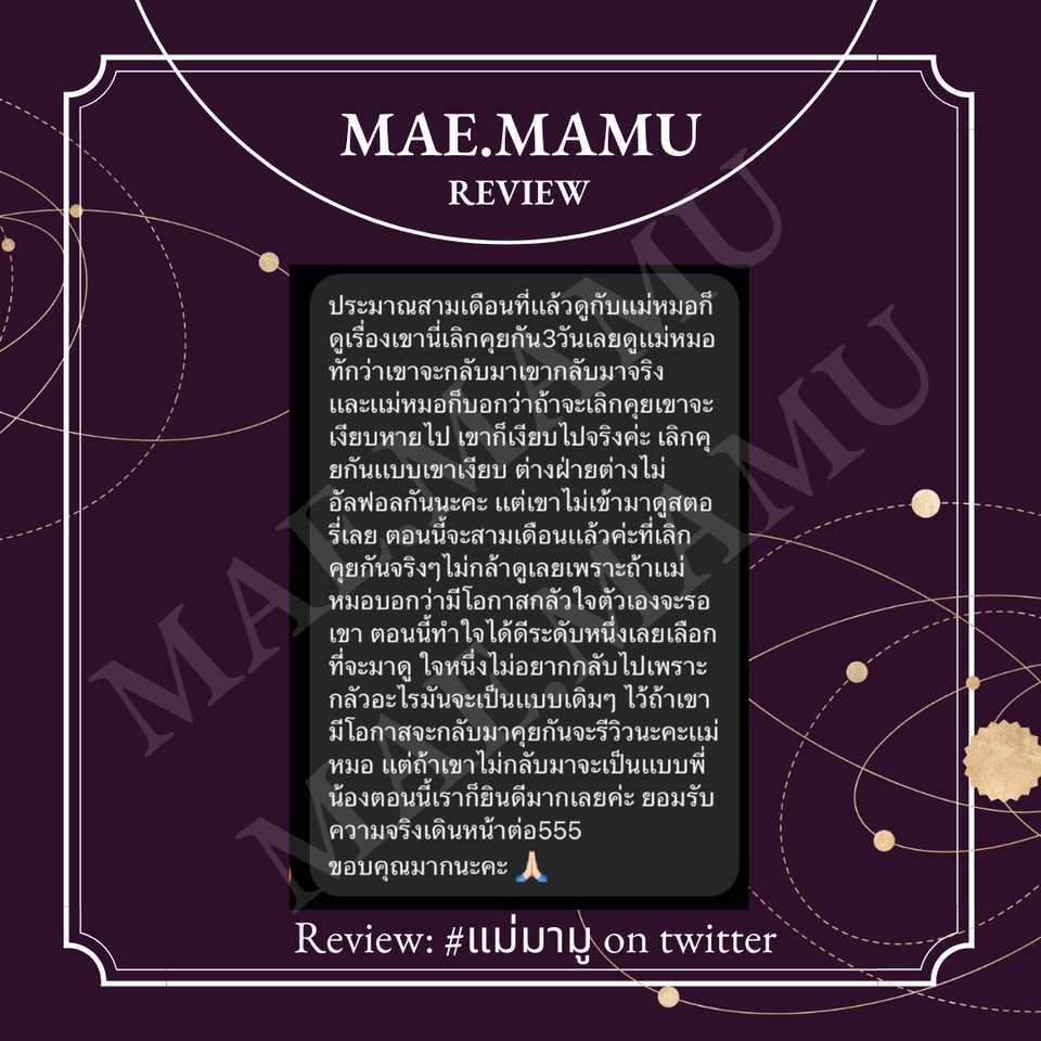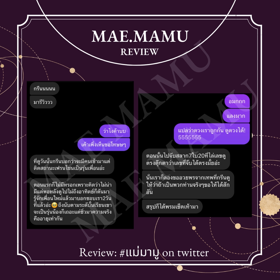 ดูดวงโดย กรีน แม่มามู IG:Mae.mamu ประสบการณ์เปิดร้านดูดวง5ปีกว่า เปิดเกษตรแฟร์โซนนิสิต3ปีซ้อน เปิดบูธดูดวงงานลอยกระทง ม.เกษตร3ปีซ้อน ออกจากต่างๆในมหาวิทยาลัยทั้งในและนอก เป็นบูธนอกสถานที่เป็นที่งานบายเนียร์อักษร จุฬา ขั้นตอนการทำงาน 1. ทิ้งคำถามไว้ 2. จ่ายเงินและแจ้งสลิป 3. รอคำทำนายไม่เกิน24ชม.