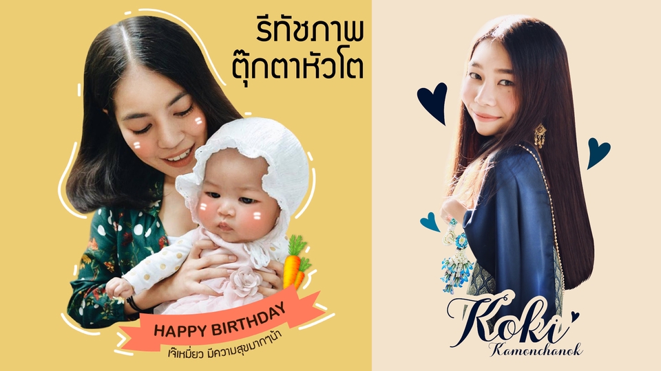 รับรีทัชการ์ตูนหัวโต สำหรับเป็นของขวัญวันเกิด ของขวัญงานแต่งงาน ไฟล์รูปขนาด A5 หรือใหญ่กว่านี้แจ้งได้ค่ะ ขั้นตอนการทำงาน 1. คุยรายละเอียดงานที่ลูกค้าต้องการ 2. รีทัชภาพตุ๊กตาหัวโต 3. ส่งไฟล์เป็น .jpeg ขนาด A5 (ไฟล์png.พื้นหลังโปร่งใสมีค่าใช้จ่ายเพิ่มค่ะ)