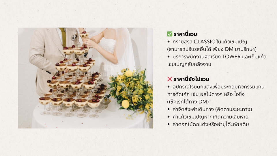 🍰✨ Tiramisu Tower – เติมความหวานให้ทุกงานพิเศษ ✨🍰 🎊 เหมาะสำหรับงานแต่ง งานวันเกิด งานปาร์ตี้ และงานเลี้ยงต่าง ๆ เพิ่มความหรูหราและบรรยากาศสุดพิเศษด้วย ทิรามิสุรส Classic เสิร์ฟในแก้วเชมเปญเรียงเป็น Tower สุดอลังการ ✅ ราคานี้รวม - ทิรามิสุรส Classic ในแก้วเชมเปญ (สามารถปรับรสอื่นได้ เพียง DM มาปรึกษา) - บริการพนักงานจัดเรียง Tower และเก็บแก้วเชมเปญกลับหลังงาน ❌ ราคานี้ยังไม่รวม - ค่าจัดส่ง (เช็คเรทได้ทาง DM) - ค่าแก้วเชมเปญหากเกิดความเสียหาย - ค่าดอกไม้ตกแต่งหรือผ้าปูโต๊ะเพิ่มเติม 💌 จองคิววันนี้ เพื่อให้งานของคุณมี Tower แห่งความหวานที่ไม่เหมือนใคร! 📩 DM เพื่อสอบถามรายละเอียดและเช็คราคาได้ค่ะ