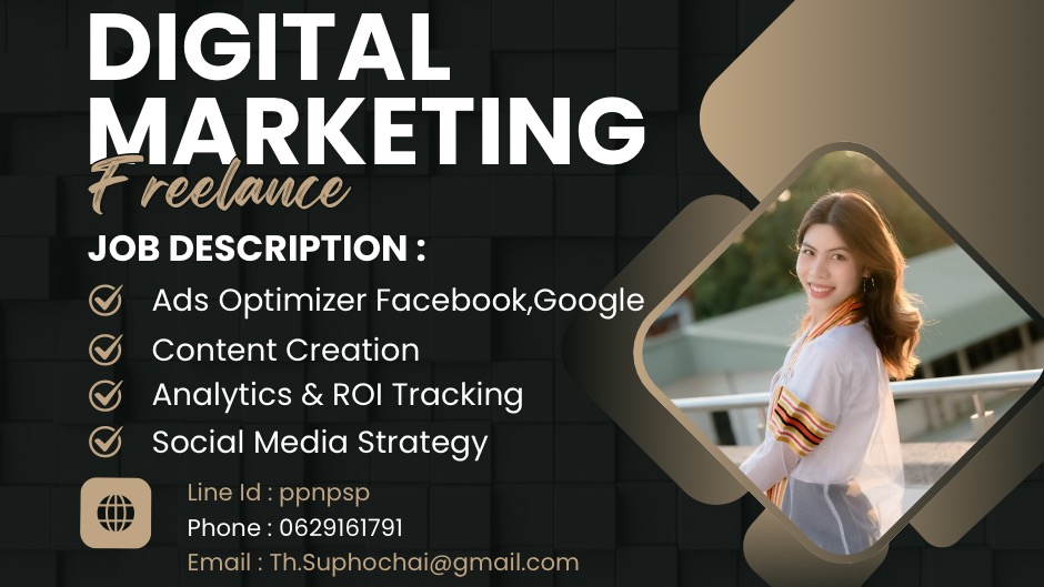 Ads Optimizer ยิงแอดฟรีแลนซ์ - Optimize Ads Facebook ,Google Ads - บรีฟงานกับกราฟฟิกสำหรับรูปภาพและคอนเทนต์สำหรับใช้ยิง Ads ประสบการณ์การทำงาน 2 ปี ตำแหน่ง Digital Marketing