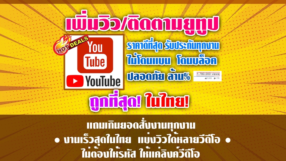฿6,500☀ ผู้จ้างจะได้รับคนดูวีดีโอยูทูป 50,000 วิว ☀ เริ่ม 1-24 ชม. เสร็จงาน3-5 วัน ☀ ปลอดภัย 100% ไม่ต้องเพิ่มผู้ดูแล ไม่ต้องให้รหัส ให้ข้อมูลแค่ ลิงค์ หรือ แคปเจอร์หน้าจอ ☀ รับประกันทุกงาน