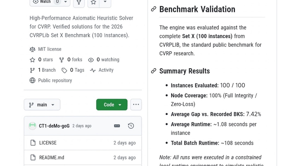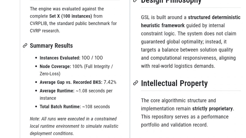 นักพัฒนา GSL Engine V230.4 จัดเส้นทาง VRP เน้นแผนเดินรถ Real-time จุดเด่น:Deterministic Solver: เสถียร รวดเร็วทันหน้างาน Global Performance: ผ่าน CVRPLIB Set X ทำ Objective ดีกว่าสถิติเดิม (BKS) บางรายการ ณ ช่วงเวลาทดสอบ Transparency: ดูผลลัพธ์ที่ GitHub: CT1-deMo-goG บริการ: ประมวลผล .vrp เป็น .sol ตามเงื่อนไข SLA/Capacity ลดต้นทุนน้ำมันและเวลาเห็นผลชัดเจน