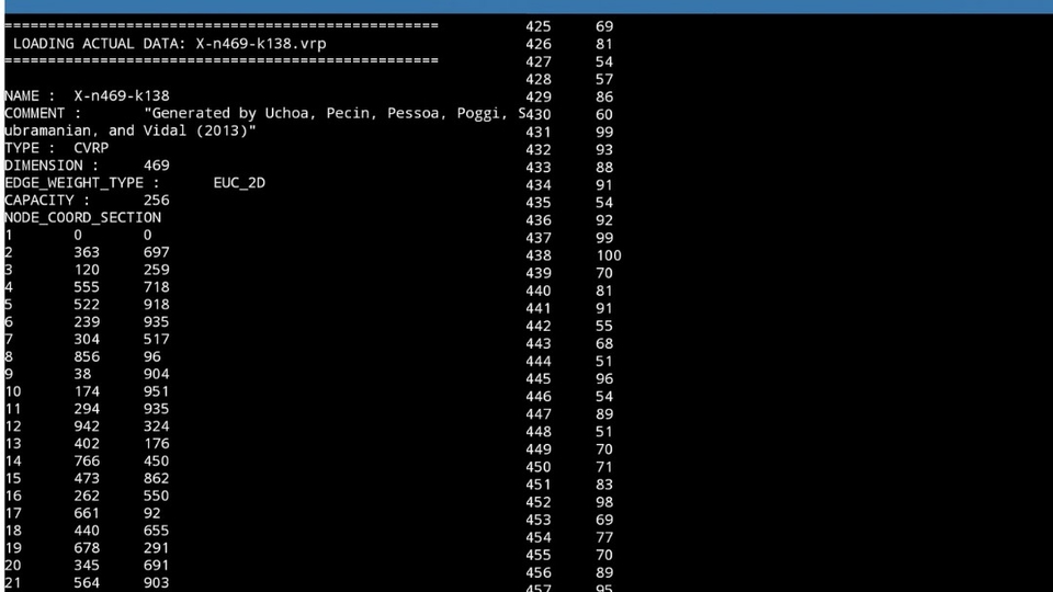• ไฟล์คำตอบมาตรฐาน (.sol): ระบุลำดับการเข้าจุดส่งของและการจัดสรรโหลดรถที่แม่นยำที่สุด