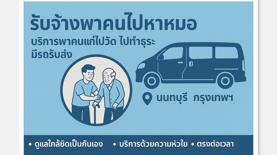 รับจ้างพาผู้สูงอายุไปโรงพยาบาล (ไปหาหมอ รับยา ฯลฯ) • มีรถส่วนตัว บริการด้วยความสุภาพและใจเย็น • เคยมีประสบการณ์ดูแลผู้ป่วยและผู้สูงอายุ • ดูแลเหมือนญาติ ใส่ใจทุกขั้นตอน • พร้อมช่วยจดข้อมูลจากหมอ หรือประสานงานให้ • บริการในพื้นที่ [ระบุพื้นที่ เช่น กรุงเทพฯ/นนทบุรี ฯลฯ] • ค่าบริการเป็นกันเอง สอบถามก่อนได้ค่ะ