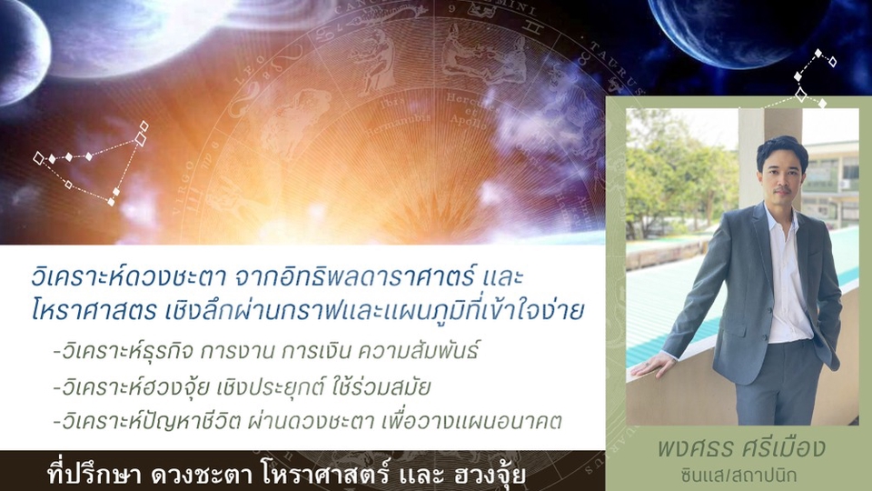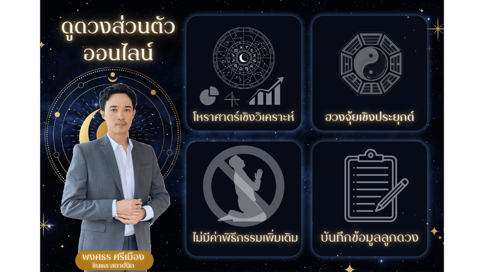 วิเคราะห์อิทธิพลของดาราศาสตร์กับดวงชะตา เช็คความโดดเด่นในดวง เพื่อวางเเผนอนาคต ประเมินธุรกิจ การงาน การเงินความสัมพันธ์จากดวงชะตา -ดูดวงออนไลน์เเบบเป็นกันเอง ดูฮวงจุ้ยด้วยวิชา ชัยภูมิมงคล ดูฮวงจุ้ยด้วยวิชา ชัยภูมิมงคลเเละสมดุลเบญจธาตุ -ปรึกษาออนไลน์ เเบบเป็นกันเอง ขั้นตอนการทำงาน 1. รับวันเวลา/เดือน/ปีเกิดของลูกค้า 2. วิเคราะห์อิทธิพลของดาราศาตร์กับดวงชะตา 3. สรุปเเละส่งมอบเอกสารการวิเคราะห์ดวง