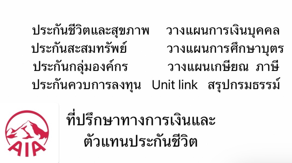 ที่ปรึกษาทางการเงินและประกันชีวิต ให้คำแนะนำด้านประกันชีวิต ประกันสุขภาพ วางแผนการเงินส่วนบุคคล วางแผนทุนการศึกษาบุตร วางแผนเกษียณ ดำเนินการประกันสินทรัพย์สูง ประกันกลุ่มองค์กร ประกันควบการลงทุน Unit link สรุปกรมธรรม์ เป็นตัวแทนระดับ MDRT จบหลักสูตร Finance Advisor ตัวแทน Full time ให้บริการได้ตลอด 24/7