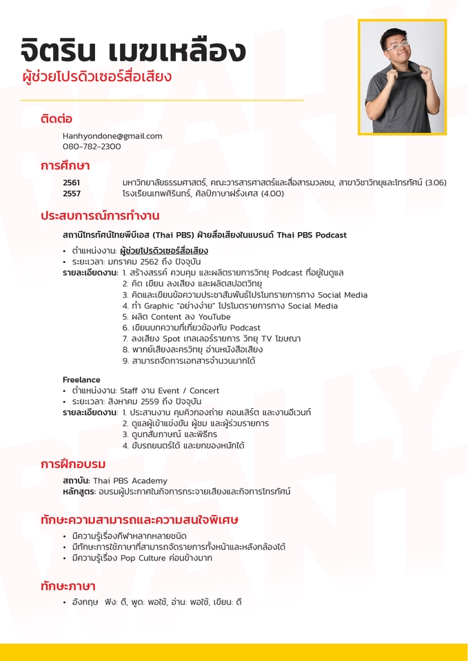 จิตริน เมฆเหลือง (ป๊อป) – นักพากย์เสียง และผู้ผลิตรายการเสียงฟรีแลนซ์ 🎙 งานด้านเสียง พากย์เสียง (Voice Over) สำหรับ Spot โฆษณา คลิปออนไลน์ และคอนเทนต์ต่าง ๆ ลงเสียงประกอบวิดีโอด้วยน้ำเสียงที่ปรับได้ตามบรีฟ ตัดต่อเสียงและจัดทำรายการ Podcast ครบกระบวนการ: วางโครงรายการ, ตรวจคำ, ตัดต่อ, มิกซ์เสียง และส่งไฟล์ พร้อมร่วมงานด้วยความยืดหยุ่นและความเข้าใจในความต้องการของแต่ละโปรเจกต์ครับ