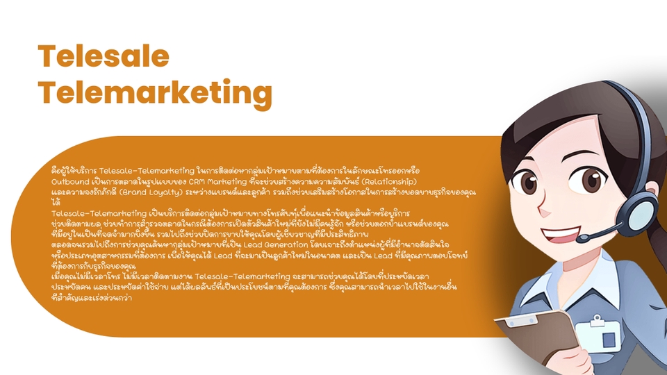 บริการตอบแชทแอดมิน - Line oa - Page Facebook - Telegram - Broadcast Line oa - IG สามารถเเชทกับลูกค้าต่างประเทศได้ เช่น อินโดนิเซีย อังกฤษ และกัมพูชา บริการ CRM ติดตามลูกค้า - เพื่อกระตุ้นยอดขาย -เสนอขายสินค้าและแนะนำโปรโมชั่น - โทร confirm ออเดอร์ - นัดหมาย/สัมภาษณ์งาน