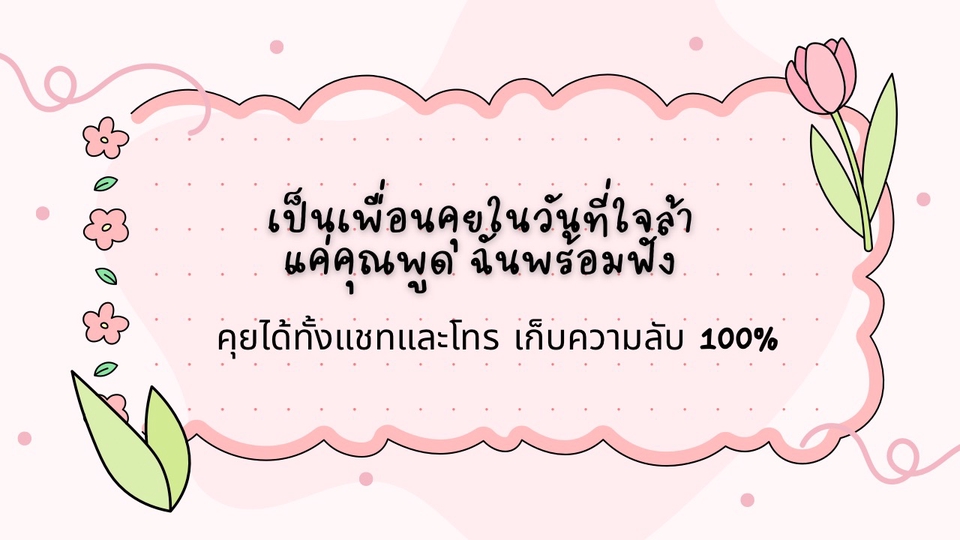 รับฟังอย่างเข้าใจ ยินดีรับฟังในทุกเรื่อง เหมือนเพื่อนที่จริงใจที่จะคอยอยู่ข้างๆคุณ พร้อมเก็บความลับในทุกๆเรื่อง ไม่มีการเผยแพร่ต่อแน่นอนค่ะ