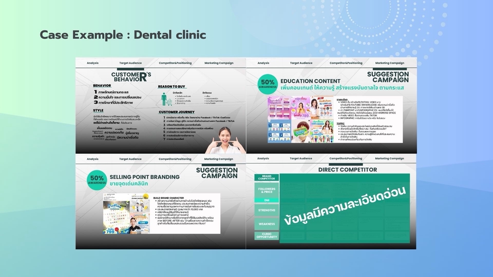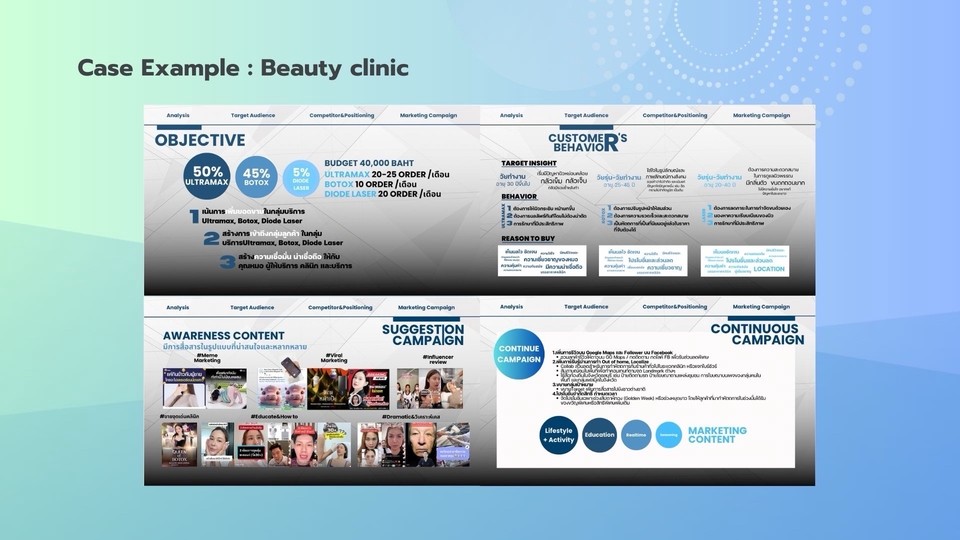 ฿10,0001.Market Analysis: Assess the market, environment, trends, and directions. 2.Customer Analysis: Understand target audience behavior, needs, and expectations. 3.Competitor Analysis: Evaluate competitors’ strengths, weaknesses, and communication strategies. 4.Brand Analysis: Review the brand’s current status, image, and unique selling points. 5.Communication Strategy Analysis: Analyze communication trends and strategies.