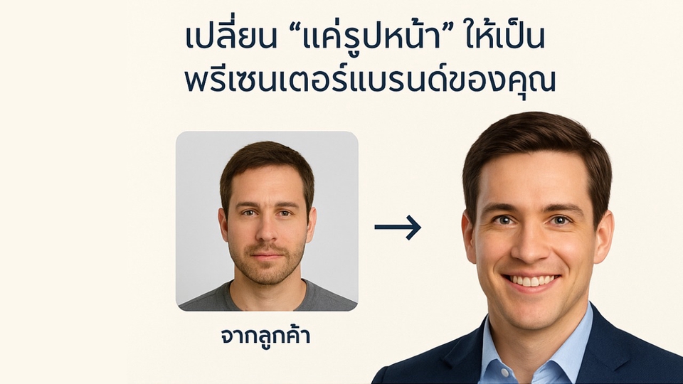 - • ภาพที่ได้จะเป็น AI Portrait พร้อมใช้งานเชิงพาณิชย์ เช่น สำหรับ Ads, เว็บไซต์, หรือหน้าร้าน